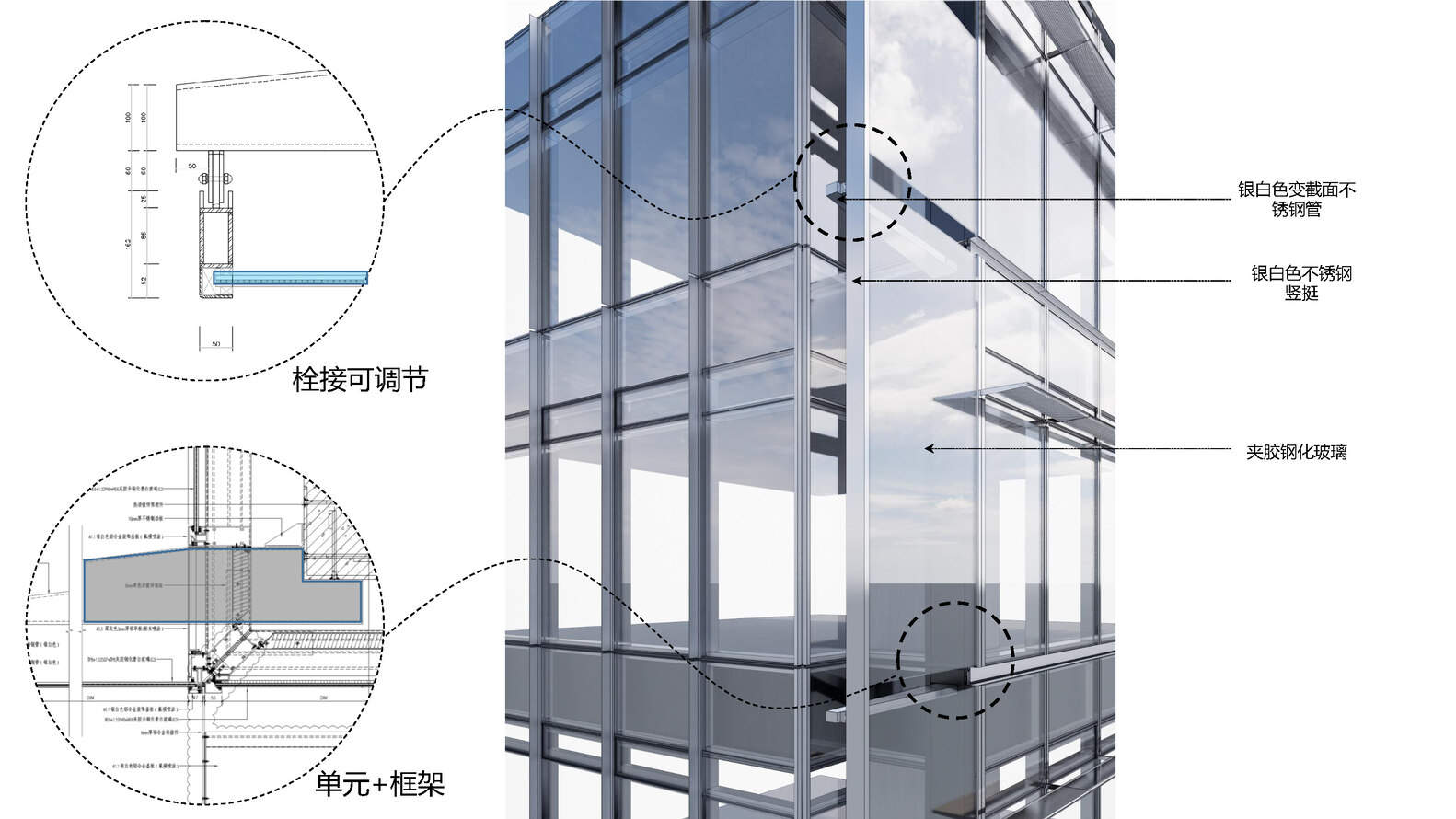 正立面幕墙选择构造较为简洁且安全的变截面不锈钢肋,支撑整体夹胶玻璃悬挑件。在施工中需先安装转角单元板块,再安装不锈钢肋及玻璃板块,最后用铝板封板。