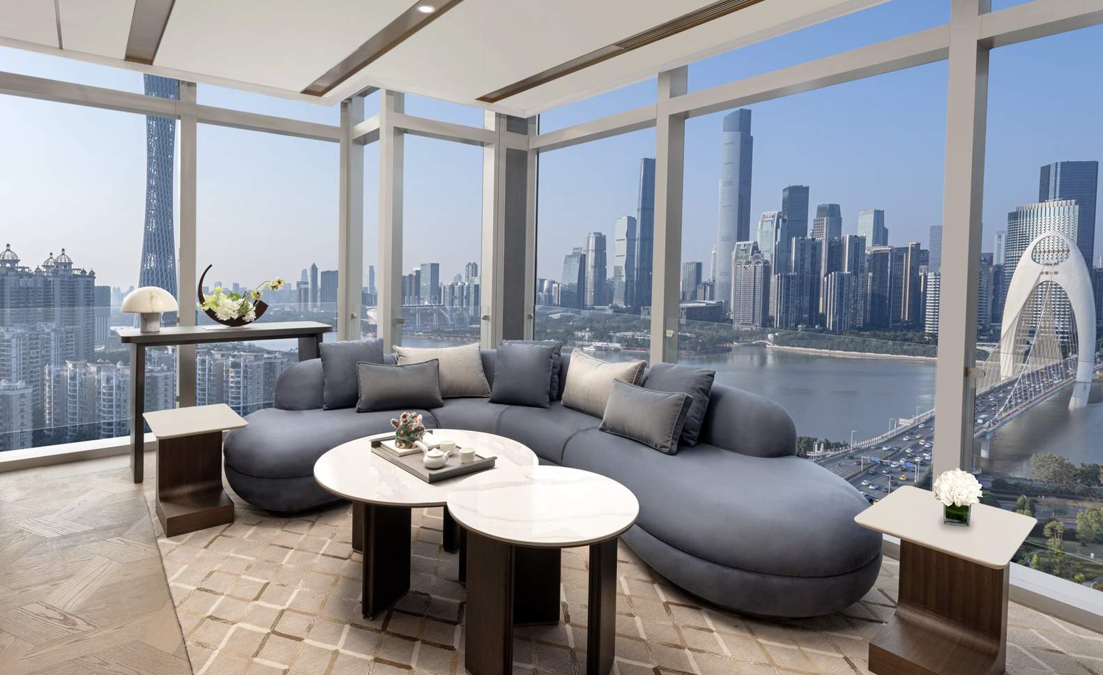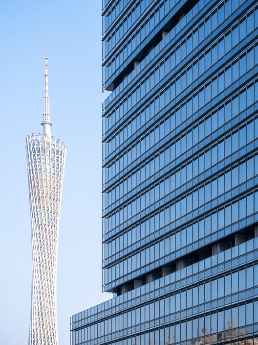 基地西北侧拥有无敌城市景观,广州塔、珠江新城、海心沙尽收眼底。对于酒店住客来说,非凡的入住体验远比酷炫的建筑造型更加印象深刻。在标准层高度统一以满足得房率要求的基础上,设计团队将酒店落客区与塔冠公区作为重点塑造区域。