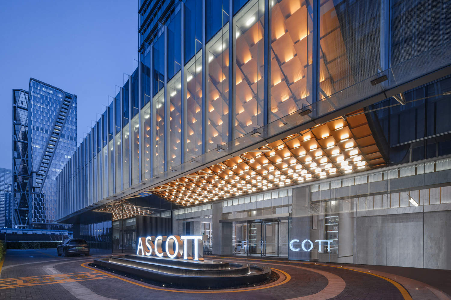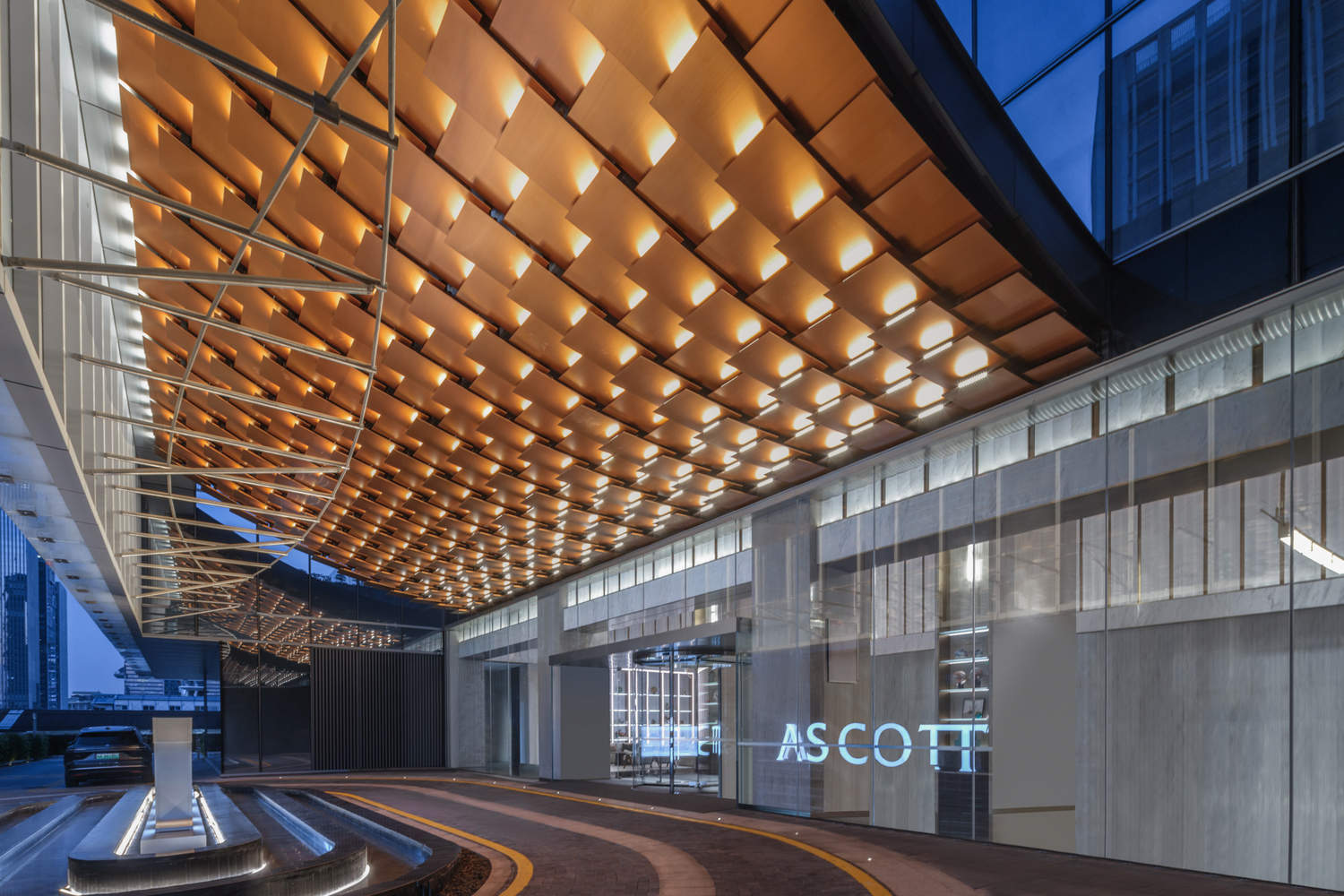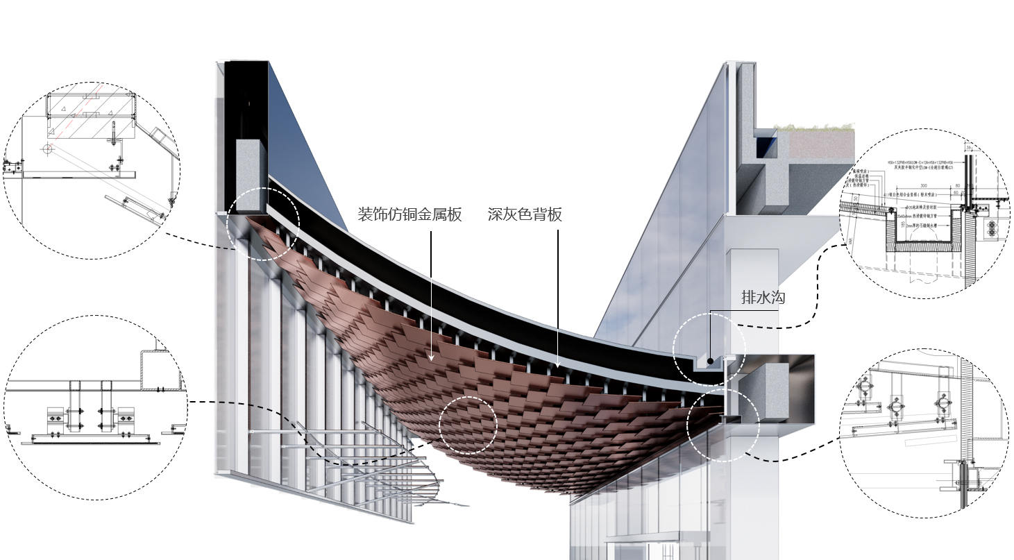 Due to the limited land conditions, the drop off area is set within the outline of the podium, and it is also impossible to create a prominent and far-reaching canopy. The design team will suspend the curtain wall of the second floor podium in the drop off area, and suspend the upper main structural beams to solve the vertical load of the curtain wall. Creatively using fish belly beams at the bottom of the curtain wall to solve the lateral wind pressure load on the curtain wall. The fish belly beam components generated by the force demand become the main visual elements of the drop off area, achieving the structure, curtain wall, and installation of the drop off area. Another major element is the "dragon scale" ceiling. The spatial form of high outside and low inside creates a suitable human scale while cleverly completing the spatial transition from the external venue to the hotel lobby. The suspended ceiling is made of imitation copper stainless steel plate, and the components are made of flat plates with uniform dimensions. The floodlight design is closely integrated with the curtain wall, with hidden lighting fixtures between adjacent ceilings, illuminating the panels from back to front, enhancing the spatial experience of "rippling waves".