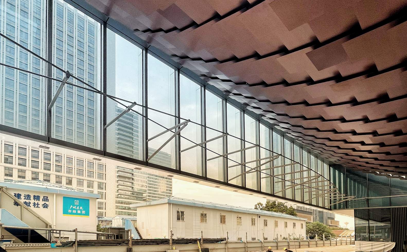 The facade curtain wall is constructed with simple and safe variable cross-section stainless steel ribs to support the overall laminated glass overhanging components. During construction, it is necessary to first install corner unit panels, then install stainless steel ribs and glass panels, and finally seal the panels with aluminum plates.
