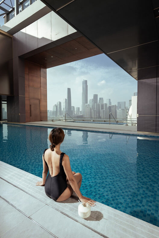 The design team arranged a 25m indoor swimming pool on the top floor, and suspended the pool outside the main building with glass boxes. Connect two swimming pools with frameless high transparency glass to create a visual effect of an infinity pool. During the implementation process, considering the local wind pressure and high-rise safety issues, the glass cantilever scheme was ultimately optimized into a solid form, which is also a major regret of this project.