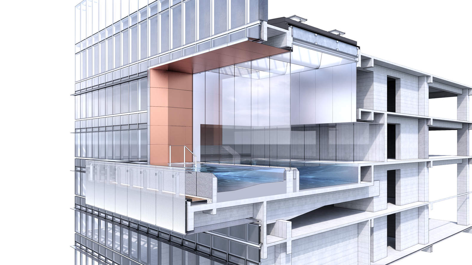 设计团队在顶层布置一个 25m 室内泳池,将泡池用玻璃盒子悬挑在建筑主体之外。两个泳池之间用无框高透玻璃联系,营造无边泳池的视觉效果。实施过程中,考虑到当地风压及高层安全性问题,最终玻璃悬挑方案优化成实体,这也是本项目的一大遗憾。