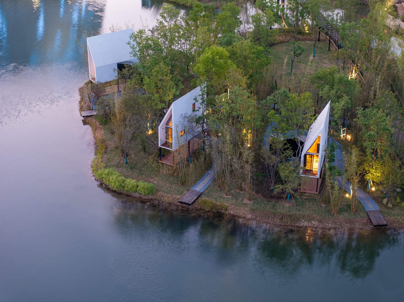 This project is located in the Ganlu Mountain Cultural and Creative City in Wuhan. It is the first large-scale "Ice and Snow+" cultural and tourism complex in Central China invested and built by Wuhan Urban Construction Group. For the first time, we have left the true wilderness and become a part of a rich cultural and tourism complex project. In this context, we still hope to create isolated spatial experiences and plan to create a series of small island wooden houses, exploring the possibility of returning to nature through different spatial forms. The 'Sail House' is part of the Nature Co construction Plan and also an attempt to explore the diversity of residential spaces.