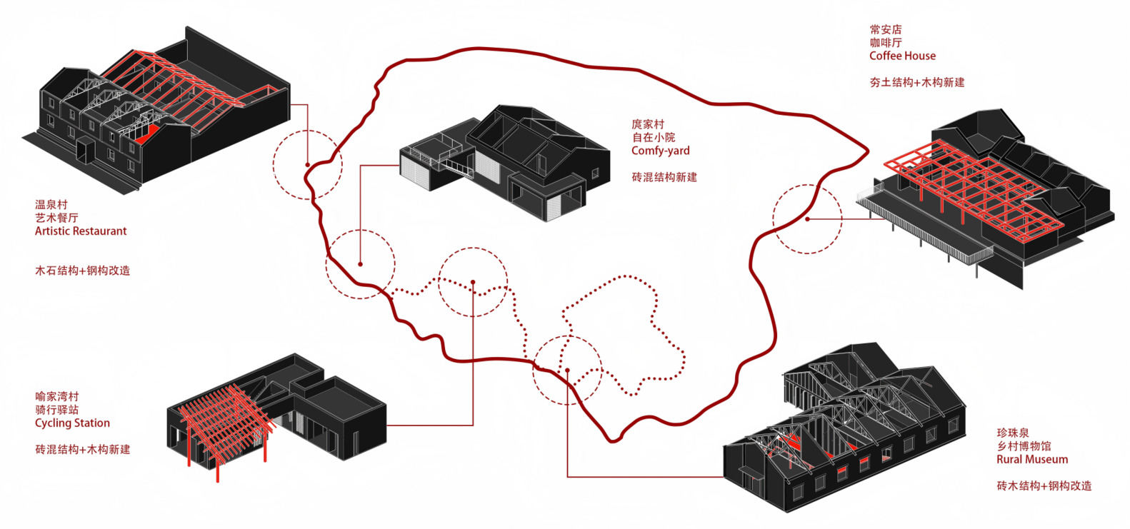 The project takes resource regeneration as the starting point to give new life to abandoned spaces: Yujiawan's red brick old house is transformed into a cycling station, providing recreational services for the greenway;; The old auditorium of Pearl Spring Village has been transformed into an intangible cultural heritage museum, carrying the memories of local culture; The former site of a Qing Dynasty temple in Chang'an has been transformed into a coffee shop, featuring rammed earth walls and modern wooden structures; The collapsed residential buildings are reborn as art restaurants, with steel structures coexisting with native green plants.