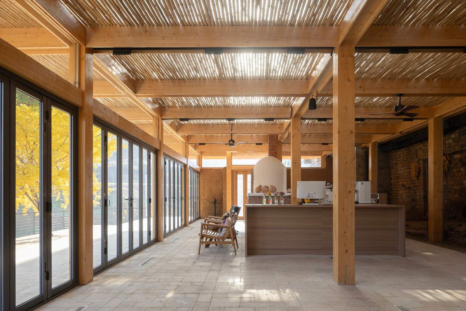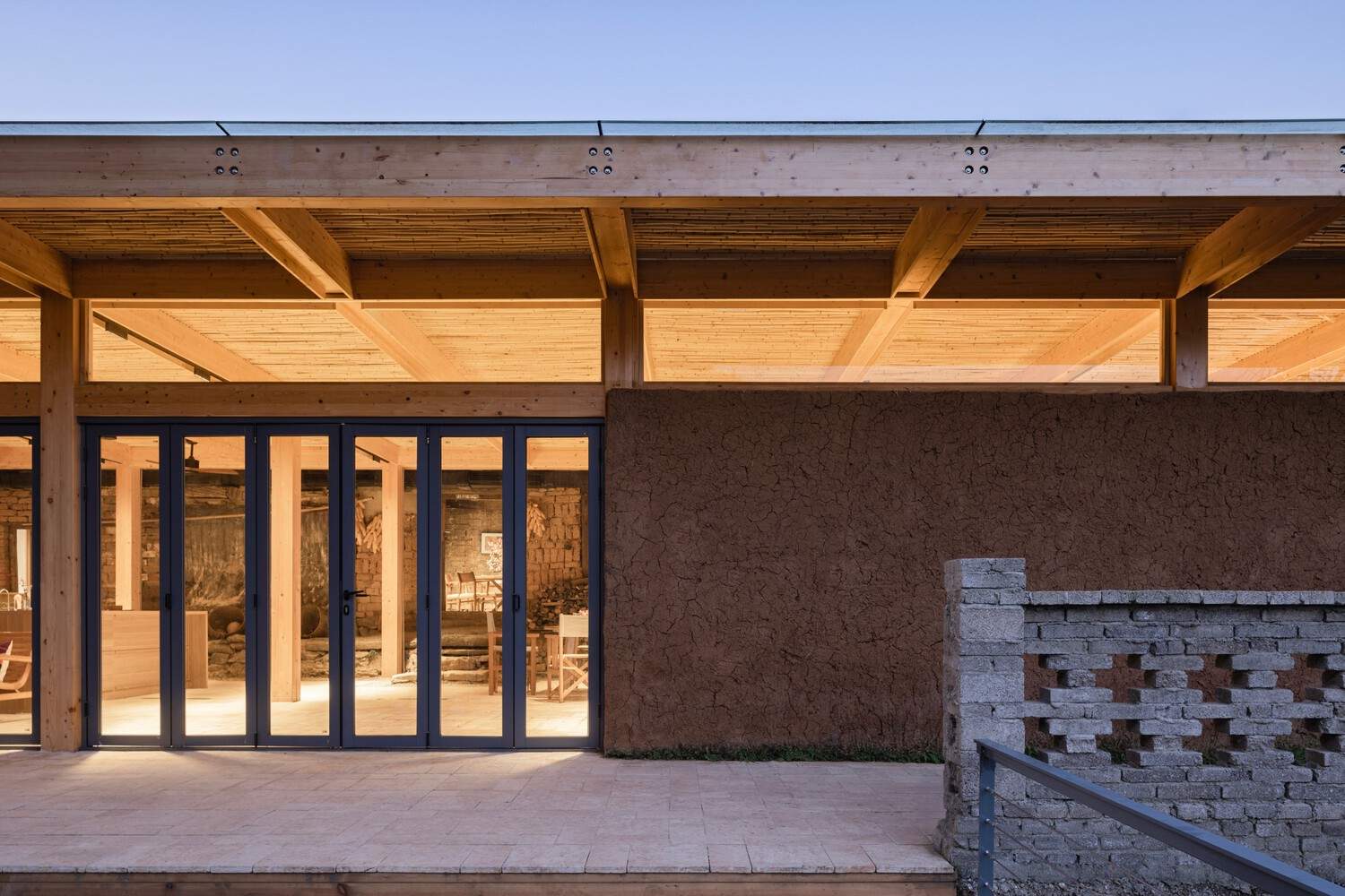适宜建造——本土材料与低技工法融合创新。自在小院采用 300mm 红砖复合墙体提升保温性;咖啡厅以胶合木构架与夯土墙并置,新旧共生中平衡保护与功能。