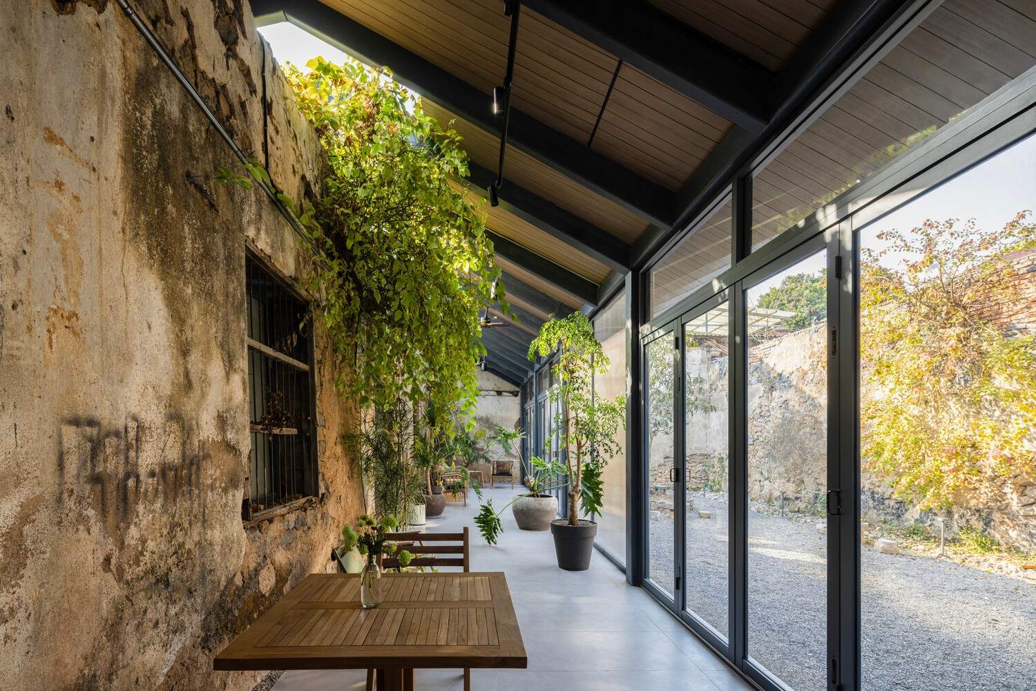 Light intervention - achieving elastic growth with minimal intervention. The art restaurant spans the collapsed stone wall with a steel structure, preserving the native plants on the wall; The steel structure enclosed by sunlight panels is embedded inside the museum, forming a spatiotemporal dialogue with historical wooden trusses.