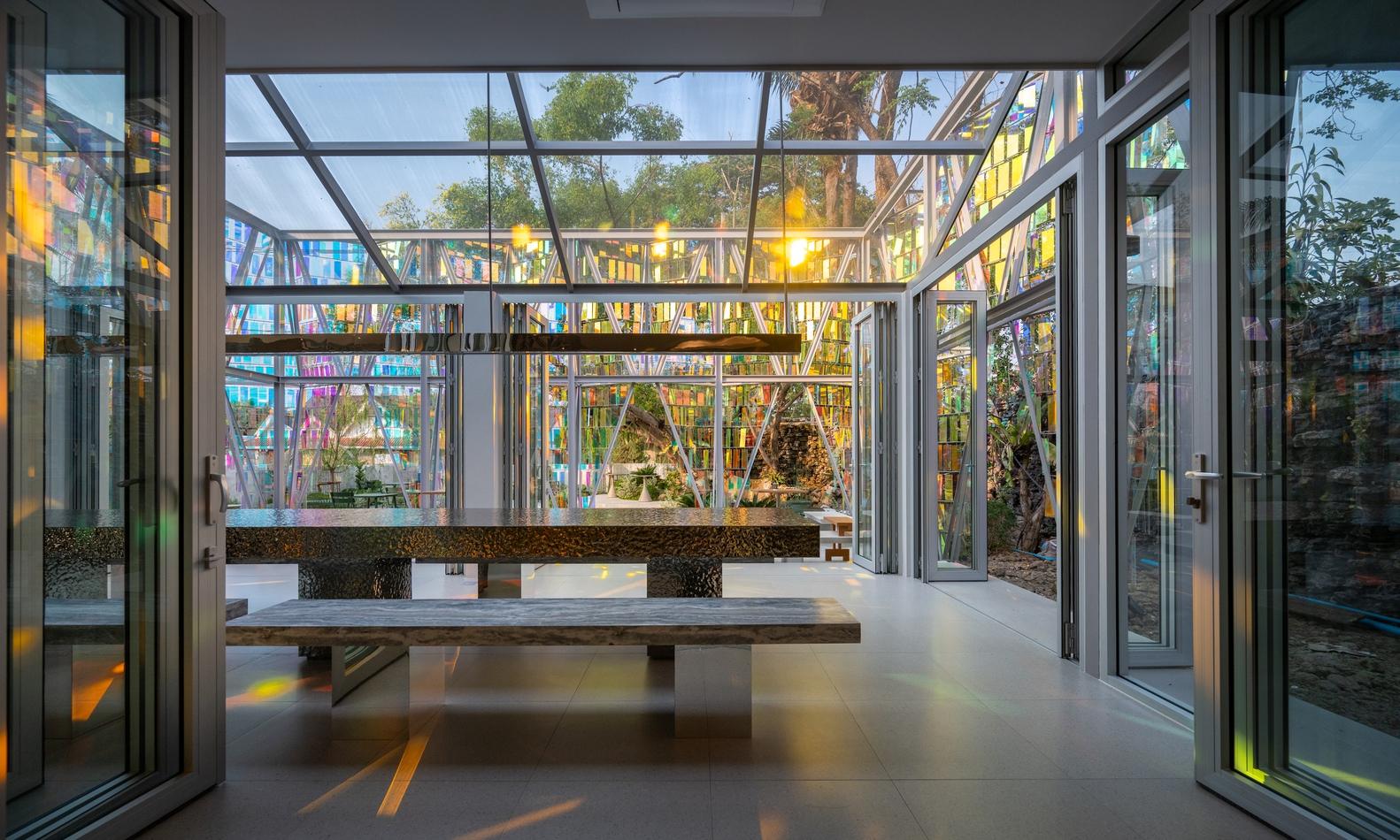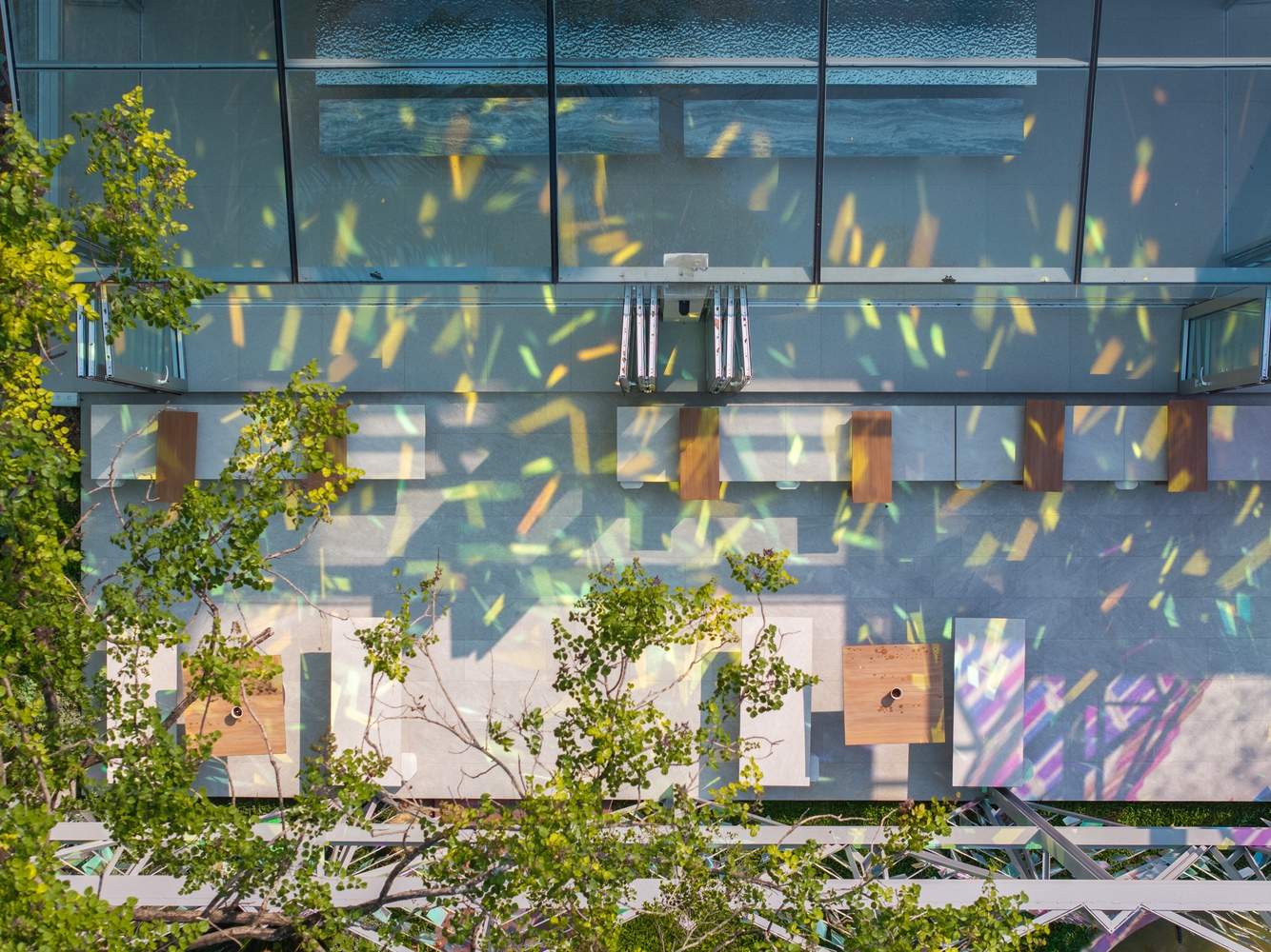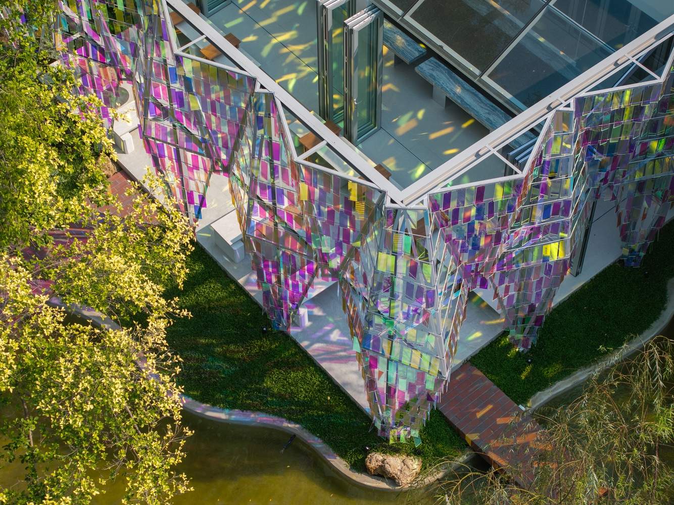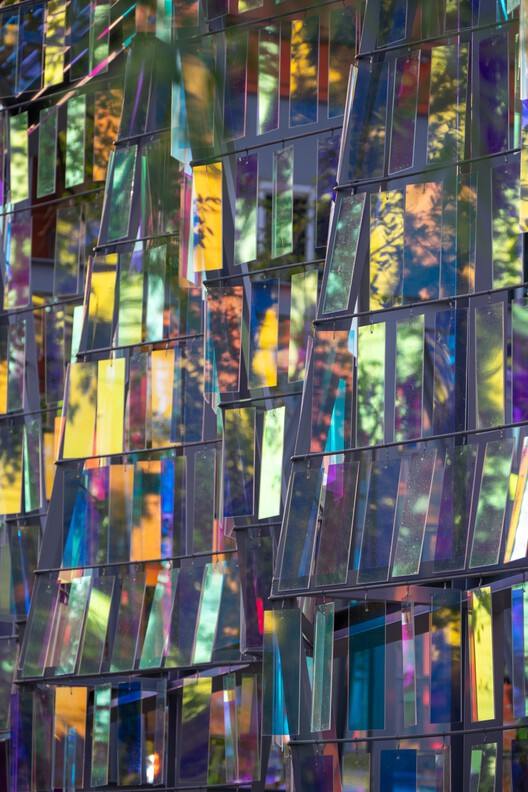 New addition: The design inspiration for the newly expanded section comes from the multi-faceted geometric shape of diamonds, using a steel structure frame and acrylic sheets coated with dual color film. These panels shimmer with rainbow colors, subtly changing colors with the angle of the sun and time of day - turning the building facade into a living gemstone that moves with the light and shines brightly.