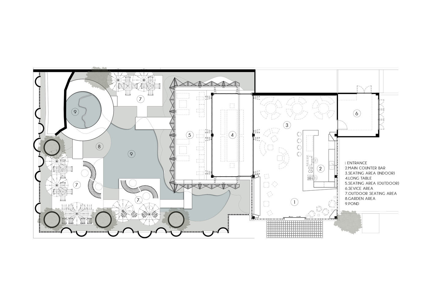 Landscape: Dialogue between Nature and Craftsmanship - Garden design adheres to the concept of simplicity and tranquility. The carefully selected green leafy plants add a soft and contrasting beauty to the rigid geometric form of the building. A free-form pond winds through the outdoor dining areas, reflecting and activating the architectural style around the clock. Local craft materials are significantly utilized, including handmade clay bricks used to construct soft curved walls. These elements inject warmth and cultural continuity into the space, cleverly blending modern expression with traditional craftsmanship.