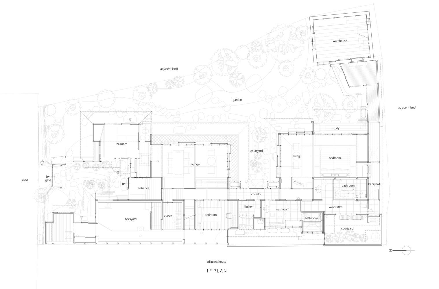 该场地南北向狭长,建筑布局于场地西侧,而花园则位于东侧。每间房间都设有大型开口,可由此观赏花园景色。数喜屋风格(sukiya-style)建筑特有的不规则平面布局,使得这座建筑与花园融为一体,构成了一个和谐的空间组合。