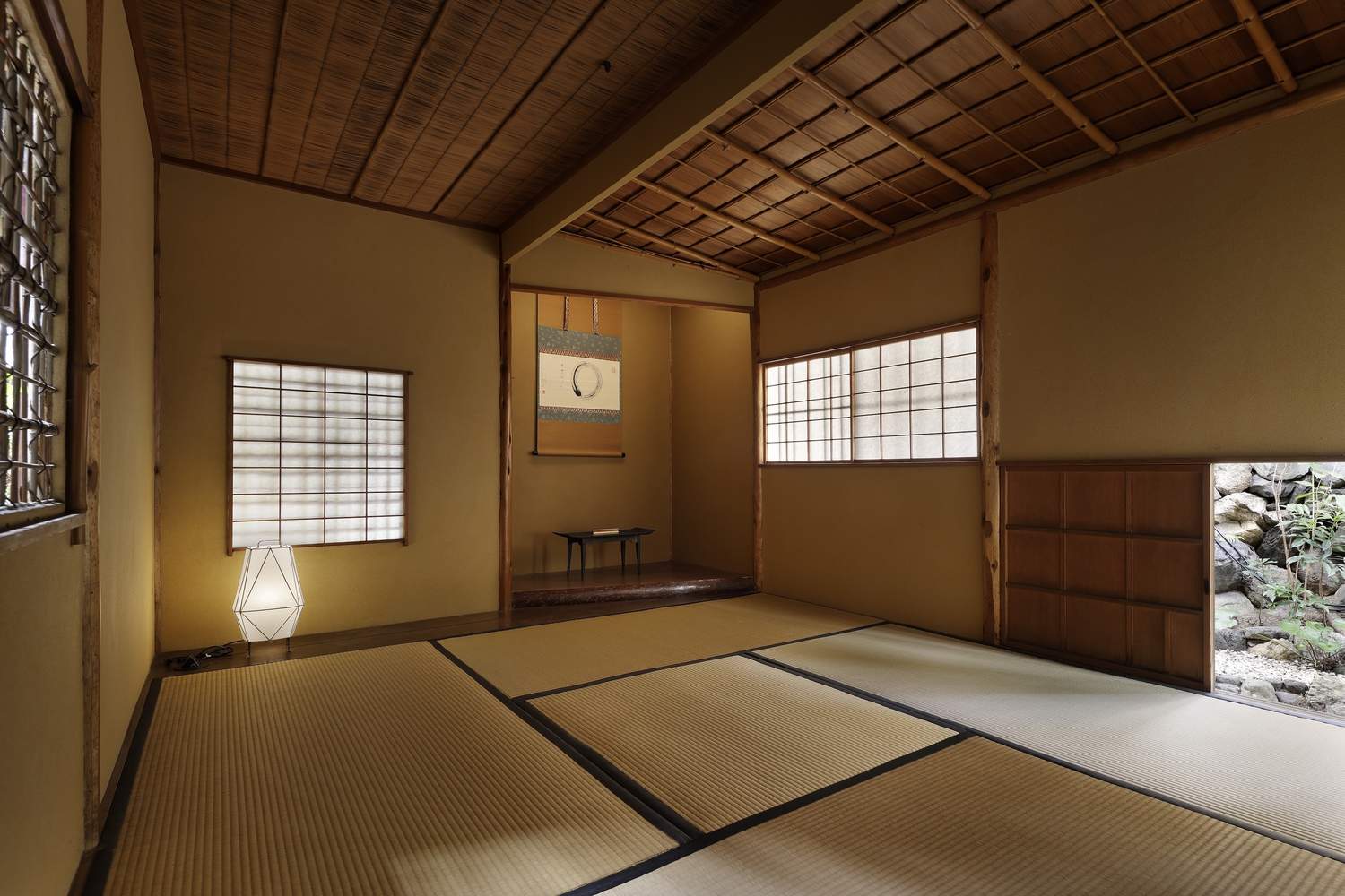 这座建筑应尽可能予以保留,但酒店设备的安装又必不可少。通常情况下,为了容纳照明、空调和消防设备,天花板会被更换。然而,在数喜屋风格(sukiya-style)建筑中,天花板设计独具特色,更换它很可能会降低建筑的价值。因此,设计团队没有为照明而改动天花板,而是替换了现有的照明设备,并尽量减少新装筒灯的数量,同时通过在下文所述的地面家具和开口处安装间接照明的方式,确保了足够的照度。空调设备也没有安装在天花板上,而是采用了落地式和壁挂式空调,此外还安装了一台通风扇,并将其作为内置家具的一部分,使其与空间融为一体。
