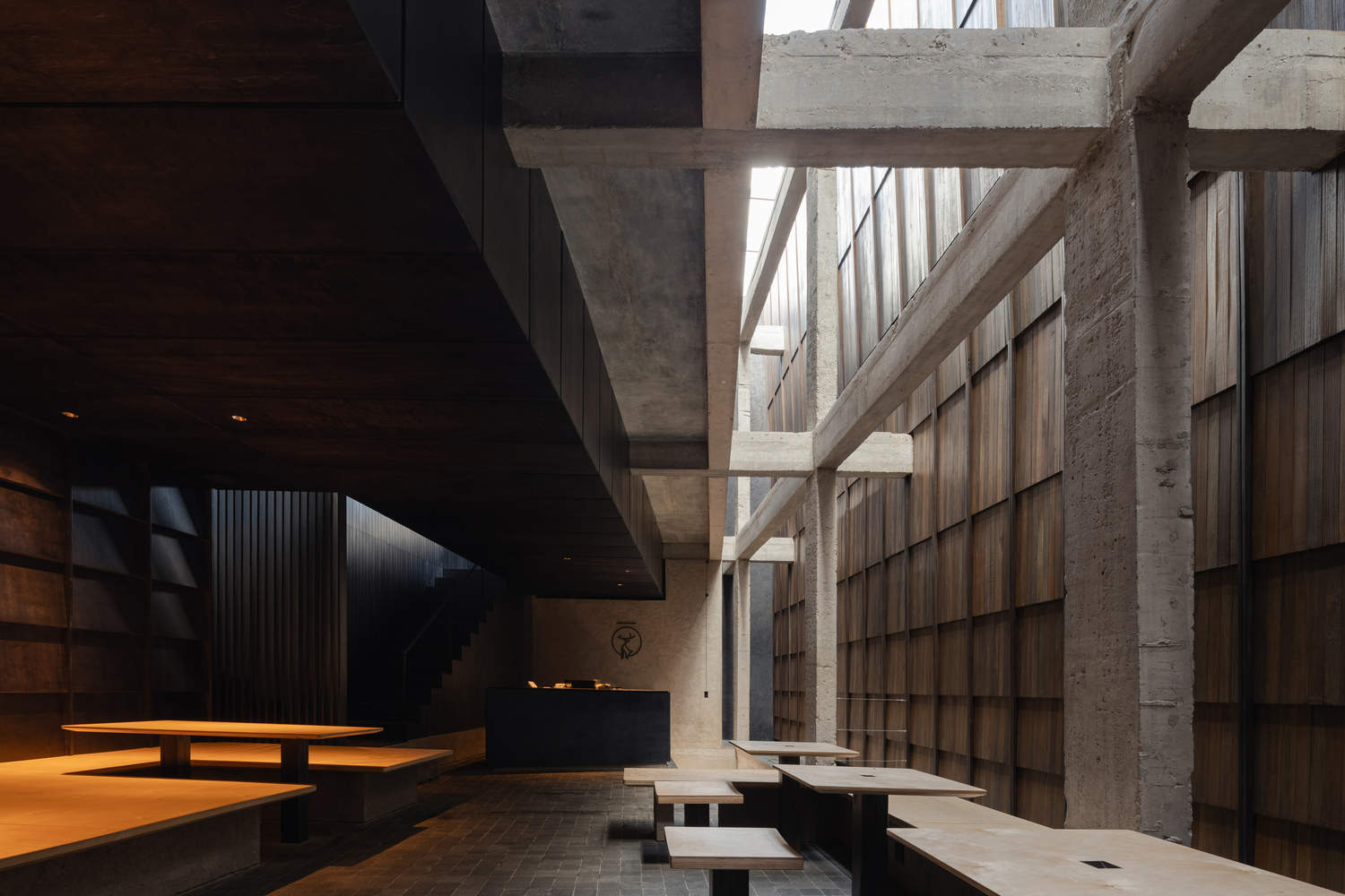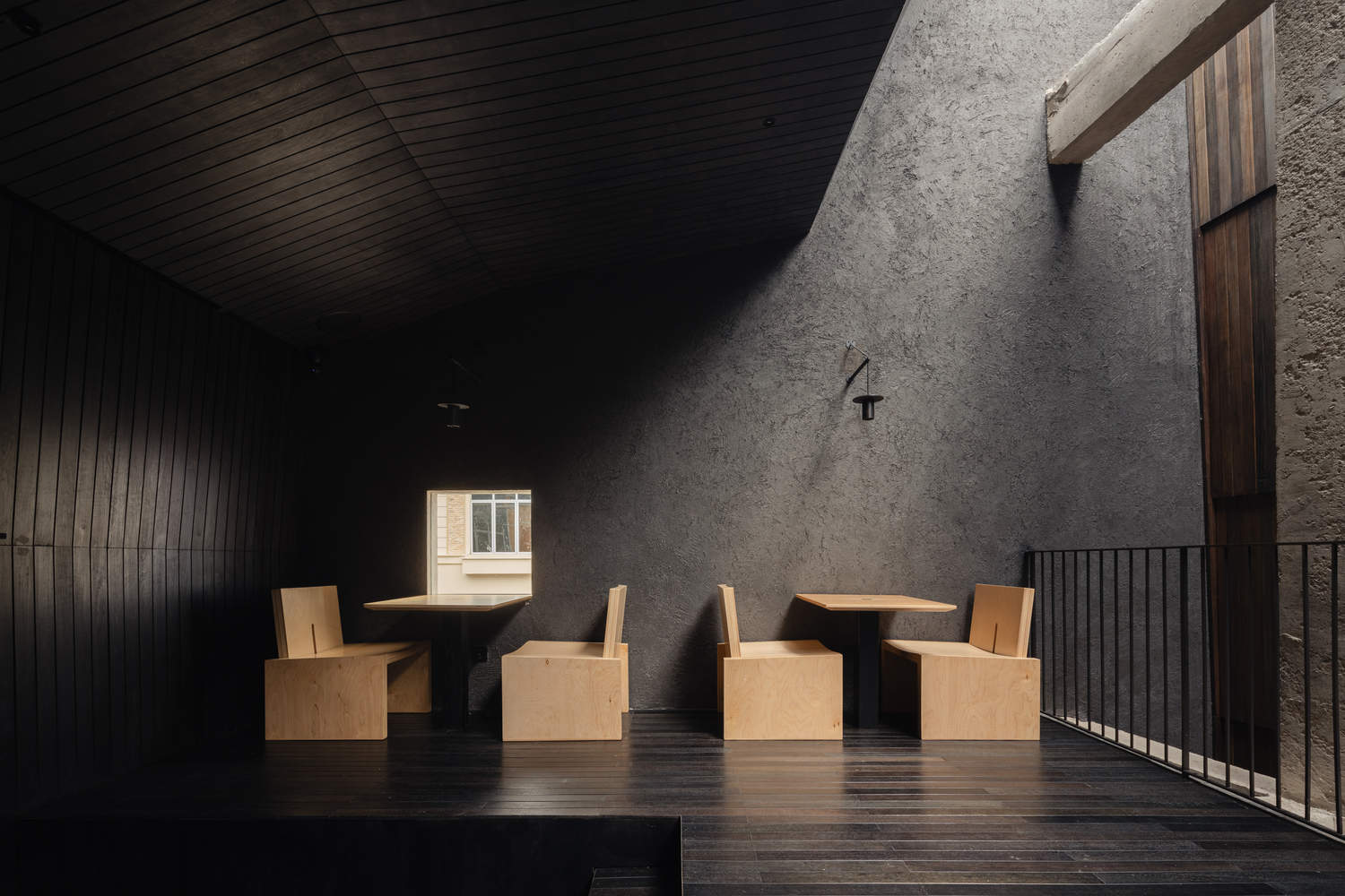 另一个关键驱动力是赋予每一家 ITSUMO 分店独特的个性。与巴厘岛(Bali)那种流动、热烈且富有曲线美的风格截然不同,巴淡岛(Batam)项目的设计要求更为严格、线条更加锐利 —— 这是一种刻意为之的对比。黑色被选定为主色调。我们从先锋日本时尚的层次质感中汲取灵感 —— 那种静谧而微妙,却又自信且丰富的风格。尤为关键的是,客户与雨的深厚情感联结激发了我们对创新中庭的设计灵感,将自然光线与雨水引入室内。然而,将这些灵感转化为实际设计面临着诸多挑战。首先,要打造出具有独特标识性的建筑,需要在设计上找到平衡点:我们采用简约的形式与克制且富有质感的立面,营造出一种与周边环境相和谐的“静谧宣言”。其次,鉴于室内设计以黑色为主色调,需避免给人以沉闷之感。为此,研究团队深入探索了天然黑色或可染色的材料,如石材、金属和木材。