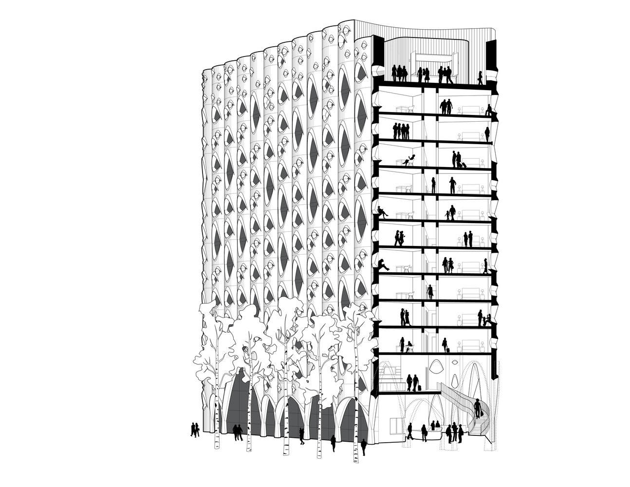 创新设计语言与自然意象的融合:Populus 酒店最引人注目的亮点在于其独特的建筑语言,尤其是标志性的“眼睛”状窗户。这些窗户的设计灵感源于白桦树树皮上的斑点,将自然形态巧妙地融入建筑立面,赋予了建筑独特的视觉辨识度。更重要的是,这些窗户不仅仅是视觉元素,它们在功能上也发挥着关键作用,通过向外延伸的设计,为室内空间提供遮阳,降低太阳辐射,从而提升能源效率。这种设计理念体现了对环境可持续性的关注,也为建筑设计提供了新的可能性,即如何在建筑形态中融入自然元素,并在功能上实现环保节能。