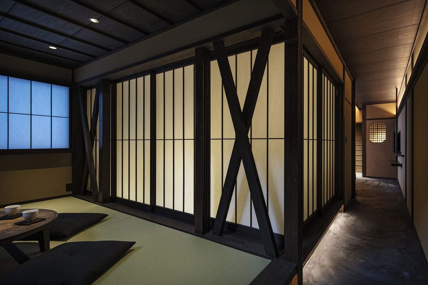 Nazuna Kyoto Higashihonganji "is a renovation project of a machiya in Kyoto with a history of over a hundred years, located on the main street directly opposite the Miyoshi Gate of Tohoto Kanji Temple. This town house consists of two buildings, originally divided into an east wing and a west wing, now connected together by a roof. Over the years, this building has undergone multiple renovations, constantly blending old and new elements.