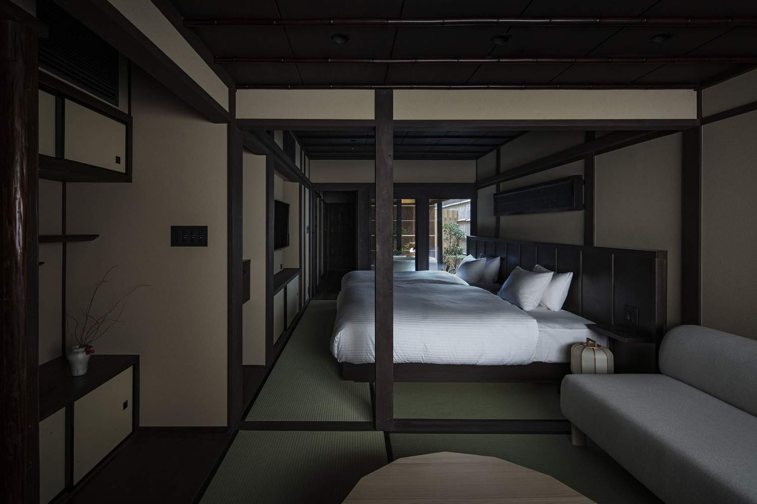空间布局的创新与实用:该项目在保留传统町屋结构的基础上,对空间布局进行了创新性的改造,兼顾了美观与实用。通过连接东西厢的屋顶,扩大了整体空间,并利用庭院引入自然光,改善了传统町屋采光不足的问题。在西厢,设计团队保留了原有的土质地板和榻榻米,营造出浓厚的传统氛围,同时与庭院相连,增强了空间的通透性。东厢的复式房间则通过抽屉式楼梯和宽敞的浴室,创造了开放而轻松的居住体验。床边的露天浴缸与庭院景观无缝融合,为客人提供了与自然亲近的私密空间。这些巧妙的设计,在满足现代生活需求的同时,也保留了町屋的特色,使酒店既具有历史感,又充满现代舒适感。