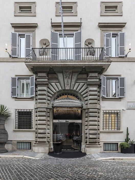 扎哈·哈迪德建筑事务所(ZHA)在整个建筑中强化了物质性、光线和形态,以构建空间——从房间到房间,从墙壁到家具。这座建筑从未给人以一种由网格、盒子、轴线或其他任何自上而下的控制系统所规划的感觉。他们不仅从穹顶构建和设计秩序,还从细节入手,一个全方位的复杂程序从所有表面散发出来,定义着空间。客房和套房内材料的组合选择了卡拉拉白色大理石和黑色大理石,与马卡萨乌木、雪松或栗木搭配,以及 Porcelenosa 公司制造的 Krion 材料,这些材料因其改善音响效果和自然调节室温的品质和功能而被选中。宫殿的贵族楼层(piano nobile)上的一些套房融入了修复的 17 世纪壁画,而较高楼层的套房则设有私人露台,可俯瞰城市全景。精致的黄铜圆环穹顶突出了大堂的熔岩石和乌木地板,而西西里岩盐、塔德拉克(一种古老的摩洛哥石灰基墙面处理工艺),以及雪松和灰烬木则经过精心加工,构成了酒店水疗中心的内部装饰。该建筑拥有 16 世纪的元素,以及后来增建的部分,也被负责古迹和历史建筑的政府部门——罗马特别考古、美术和景观监督局(Soprintendenza Speciale Archeologia, Belle Arte e Paesaggi di Roma)列为保护对象。经过广泛的调查确定,该建筑的结构需要大幅加固。 49 家公司参与了宫殿的修复工作,提交了 230 份不同的建筑许可申请,所有工程均由作为国家历史遗迹的监督局监督。
