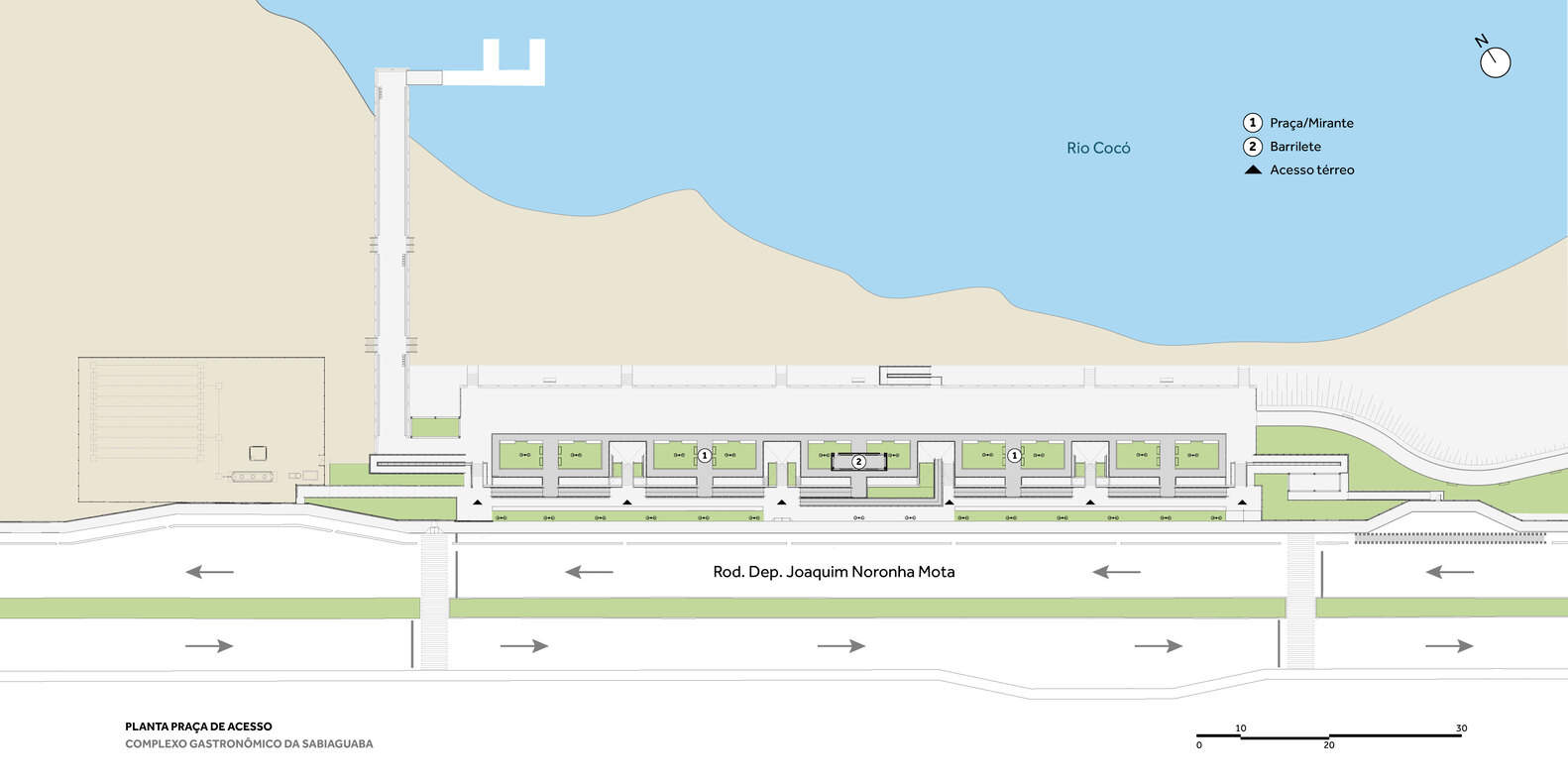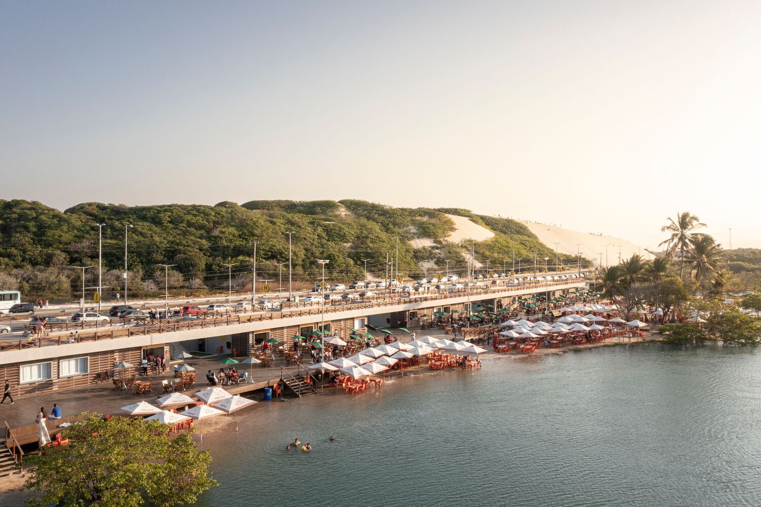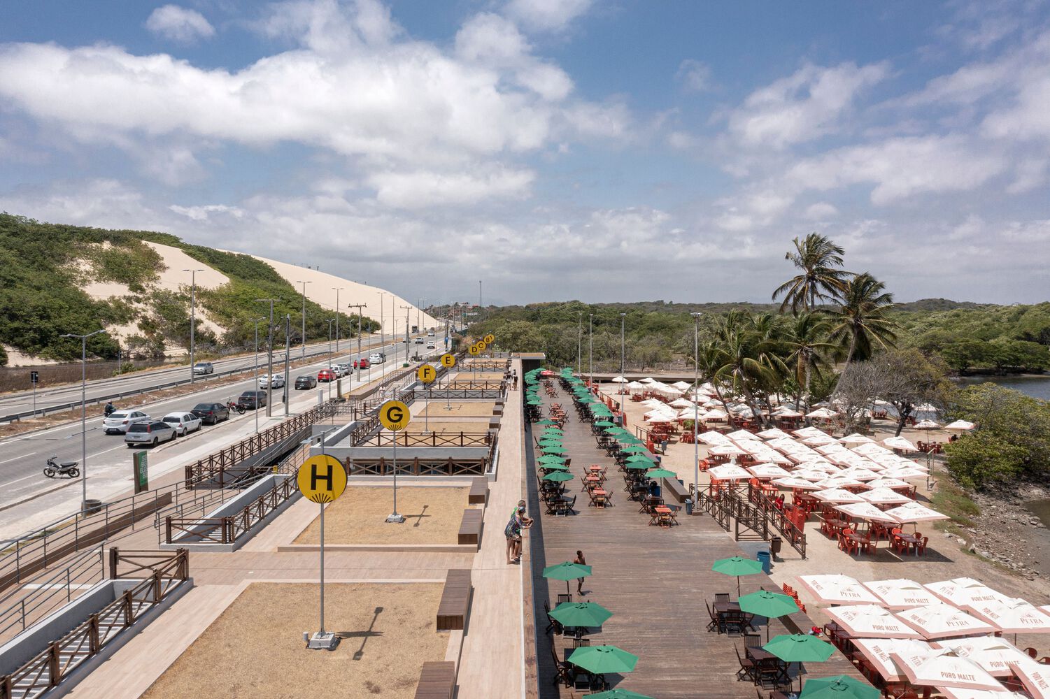 通过坡道或楼梯,游客可以前往一楼,那里有一个悬挂在自然地形之上的大型平台,能够适应该地区的潮汐变化,并有助于恢复本土植被。在这一区域,设有20个小亭,用于准备传统的 Sabiaguaba 美食。这些亭子的经营者都是原住民社区的成员,他们使用新鲜的鱼类、贝类和海鲜,制作诸如蒸生蚝、鱼炖菜、椰子拜奥(一种巴西传统菜肴)和贝类法拉法(一种巴西传统小吃)等传统菜肴。