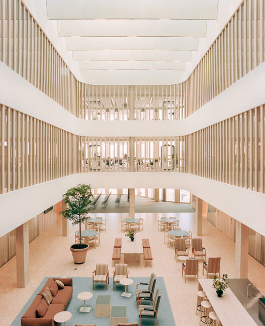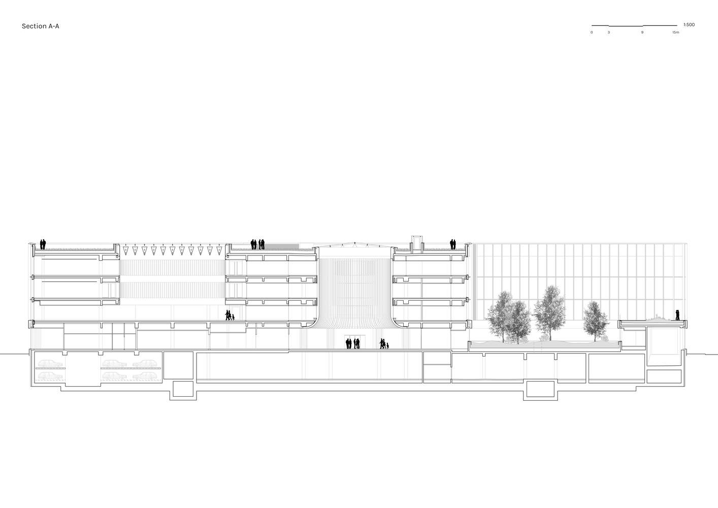 大楼地上四层,设有一个公共可达的绿色屋顶露台,以及一个包含技术设施和停车场的地下室。大楼被设计为北欧领先的林业公司斯道拉恩索的新总部,其中一半被酒店占用。街道层面的空间与周围城市两侧相连,设有宽敞、共享的开放式大厅、餐厅、咖啡馆和会议空间。结构系统和空间设计确保了内部空间在长期使用过程中具有最大的灵活性和适应性。裸露的云杉结构与精心设计的云杉和梣木细节展现了木材作为建筑材料的自然多样性。室内设计以自然、可持续且随时间推移而愈发美丽的材料为主。除了木材外,建筑外墙和室内外铺地所用的维塔萨里灰色花岗岩也将大楼与城市环境紧密相连。大楼的户外空间以北欧自然风光为灵感,庭院内设有桦树林,屋顶上则是群岛风格的草地。