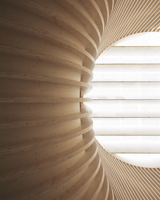 The project aims to minimize climate impacts and fully utilize renewable resources and materials throughout its long-term lifecycle. The above ground structure of the building adopts standard, industrialized, and prefabricated Stora Enso large-sized wooden products, which are tailored for pioneering structural and architectural solutions. The beam column frame and facade structure are made of laminated veneer lumber (LVL) produced by Valkos, Finland. The interior walls, elevator shafts, stairwells, floor slabs, and roof structures used for structural reinforcement are made of Cross Layered Timber (CLT) produced in Grovon, Sweden. The entire framework consists of 7600 cubic meters of spruce and 2500 wooden components.