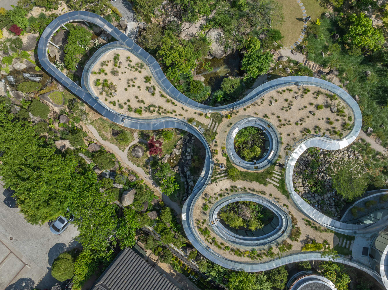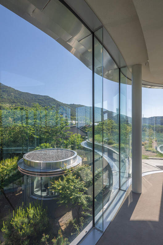 To enhance this experience, the presence of buildings is minimized as much as possible. The 28mm thick curved glass exterior wall brings maximum transparency, requiring technical solutions in structural design, insulation, and installation. The stainless steel eaves extend along the curves of the building, regulating sunlight and enhancing the flow of form. Multi level eaves and roof greening combine structure with ecology, while prefabricated metal components simplify construction and improve accuracy. MIGIUI means "unknown" in Korean, representing the space between architecture and nature, stillness and existence. It invites tourists to embark on a quiet journey of rediscovery - not only to rediscover this land, but also to rediscover themselves.