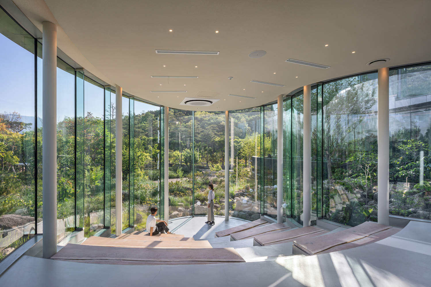为了提升这一体验,建筑的存在被尽可能地最小化。28 毫米厚的曲面玻璃外墙带来了最大的透明度,在结构设计、保温和安装方面要求技术解决方案。不锈钢屋檐沿着建筑的曲线延伸,调节阳光并强化了流动的形式。多层次的屋檐和屋顶绿化将结构与生态相结合,而预制金属构件则简化了施工并提高了精度。MIGIUI 在韩语中意为“未知”,它代表着建筑与自然、静止与存在之间的空间。它邀请游客踏上一段安静的重新发现之旅——不仅是对这片土地的重新发现,也是对自己的重新发现。