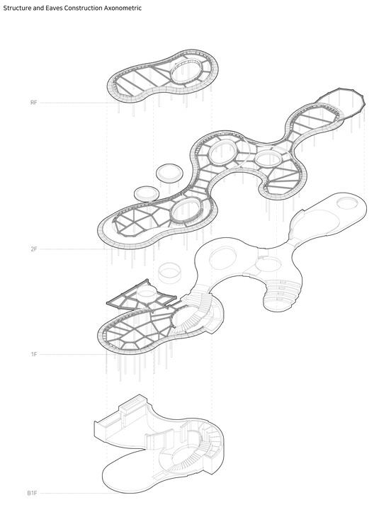 The first step is to restore the land. The western part of the site has been lowered to reconnect with the reservoir and form a gentle slope towards the eastern road. Introduced local trees, stones, and water elements to evoke memories of the primitive forest. The architecture follows this concept - conceived as an 80 meter long forest path connecting the entrance and the water's edge. The caf é space, lounge area, and atrium are quietly embedded along this route, blurring the boundaries between the building and the natural environment.