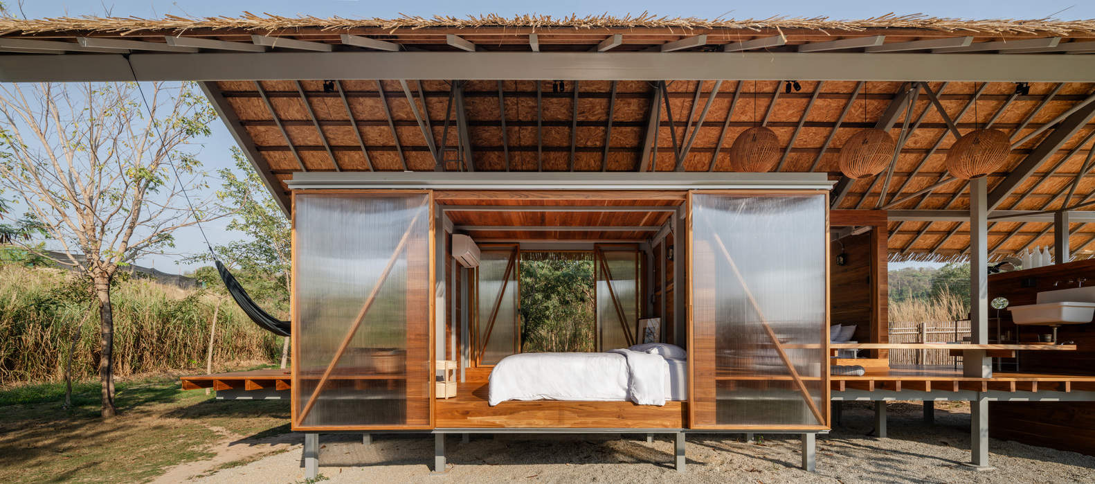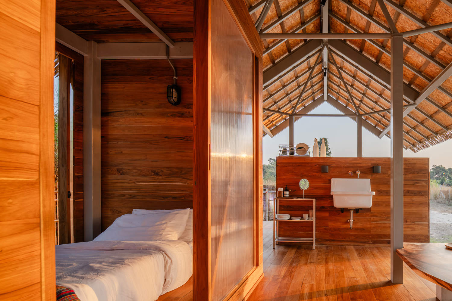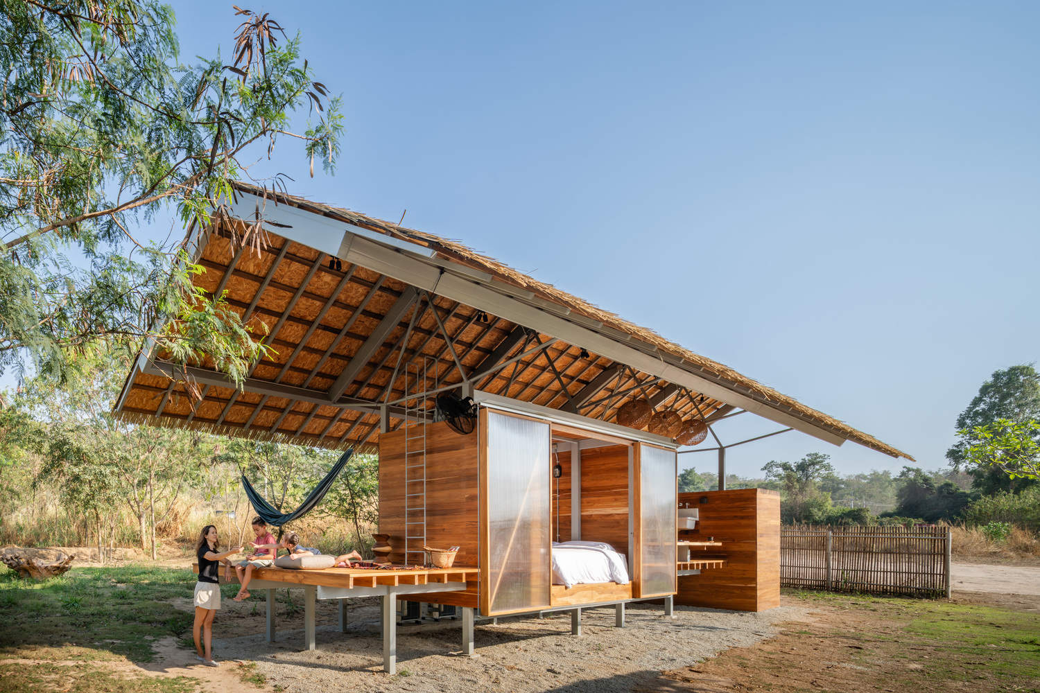位于泰国春武里府广袤田野之中的Kid Cabin,是为客户的孩子设计的一处休憩之所,它紧邻父母的房车。这座小屋受树屋精神的启发——虽建于地面而非悬空——却同样秉持着简约、自然与趣玩的理念。小屋采用轻质柚木结构,借鉴了传统泰式房屋的风格,包含两间紧凑的卧室、一间共用浴室以及一个作为公共生活空间的开放式露台,模糊了室内与室外的界限。