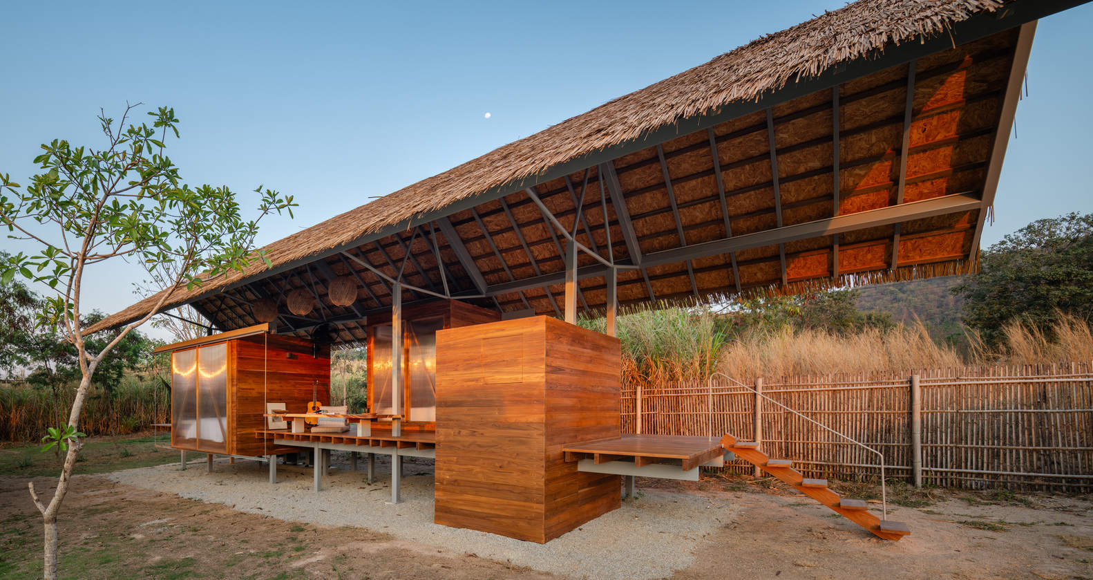 Kid Cabin, located in the vast fields of Chumphon Province, Thailand, is a resting place designed for clients' children, adjacent to their parents' RV. This small house is inspired by the spirit of treehouses - although built on the ground rather than suspended - it also upholds the concepts of simplicity, nature, and fun. The cabin adopts a lightweight teak wood structure, borrowing the style of traditional Thai houses, including two compact bedrooms, a shared bathroom, and an open terrace as a public living space, blurring the boundary between indoor and outdoor.