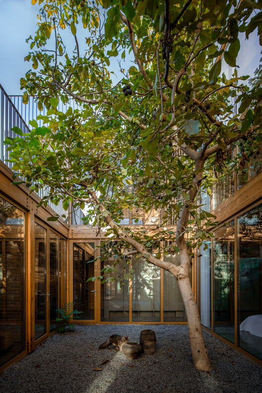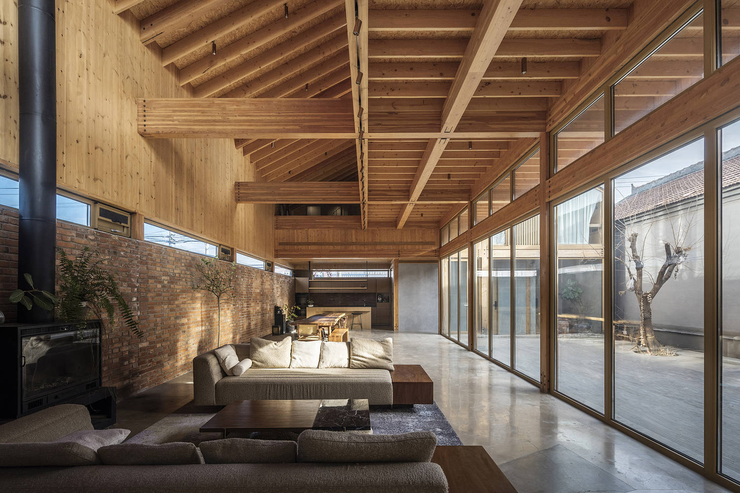 The first floor of the building is enclosed by solid walls along the street boundary, while the interior is fully open to the courtyard, featuring public leisure spaces such as a living room, dining room, kitchen, and a homeowner's bedroom. On the second floor, there are three staggered platforms floating on the brick wall, forming a view with trees of different postures. Six guest rooms are arranged here, including standard rooms, tatami single rooms, loft family rooms, and other types. The building has opened up two rooftop platforms, offering a distant view of the nearby mountains from a high altitude.