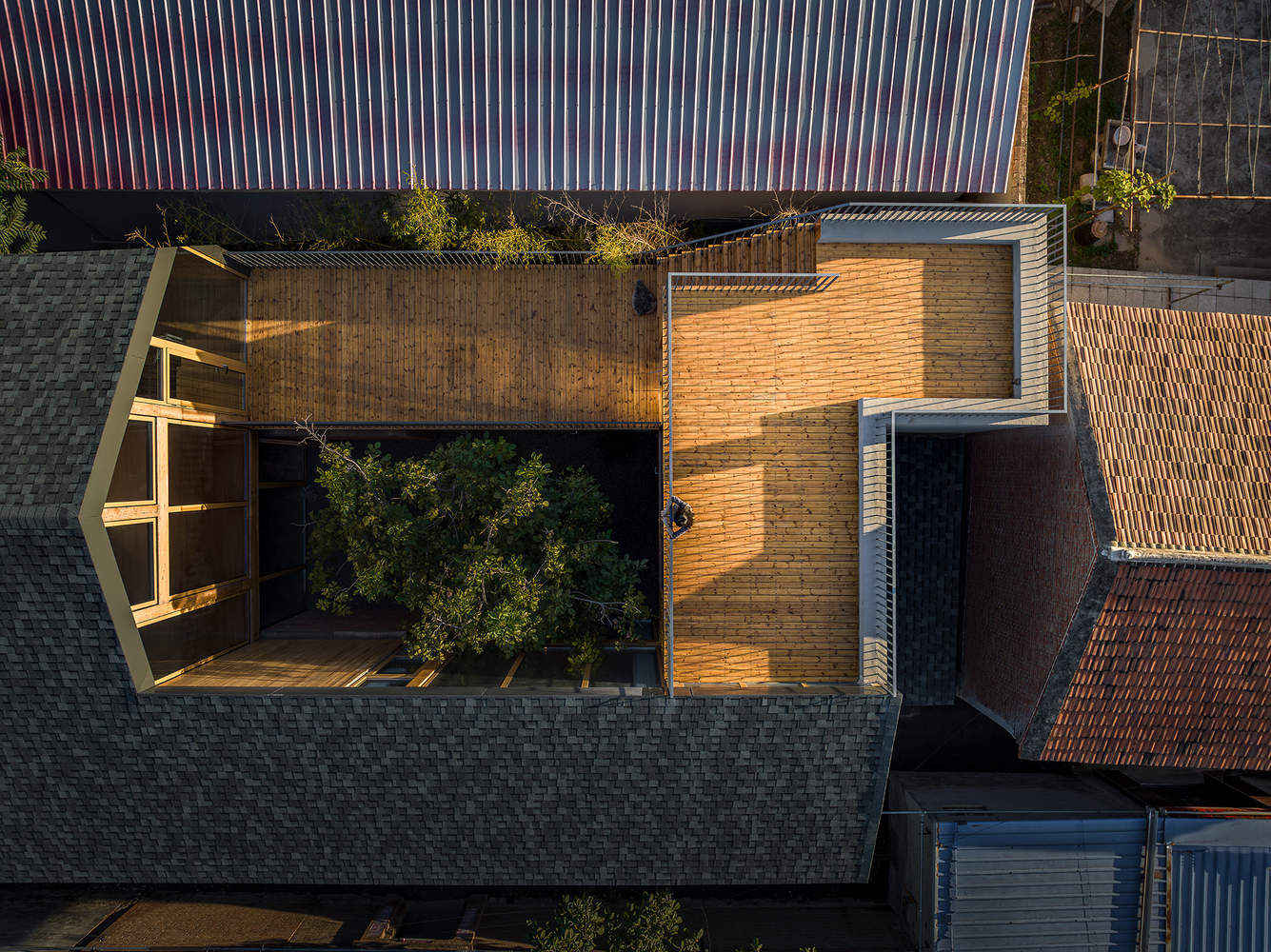 All walls are constructed using recycled old bricks from the site, achieving reuse. The internal wooden partition wall should be integrated with the building and interior as much as possible to avoid increasing the cost of secondary decoration. The asphalt tiles on the roof extend to the second floor wall, like a gray house floating on top of the fence, enhancing the building's recognizability.