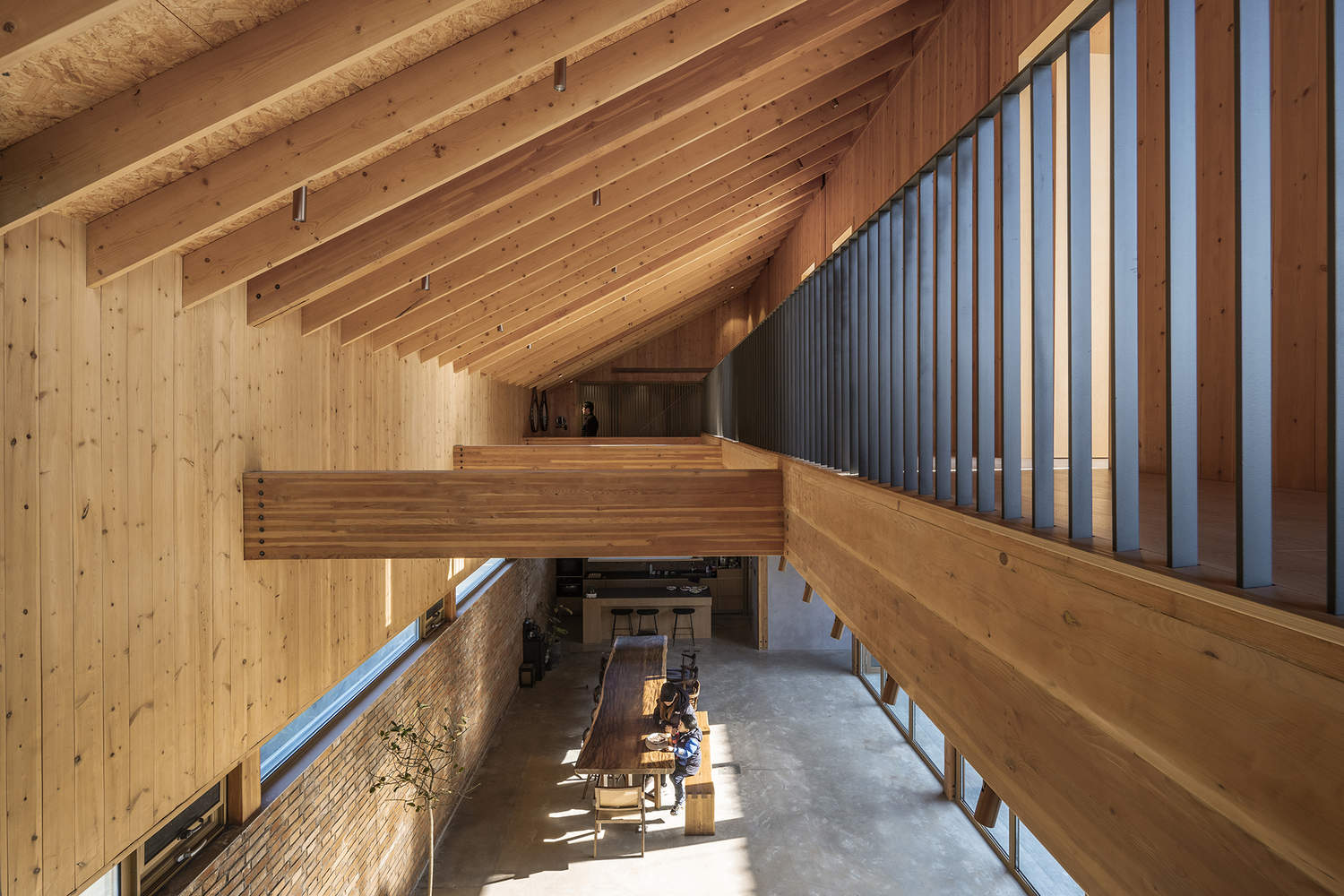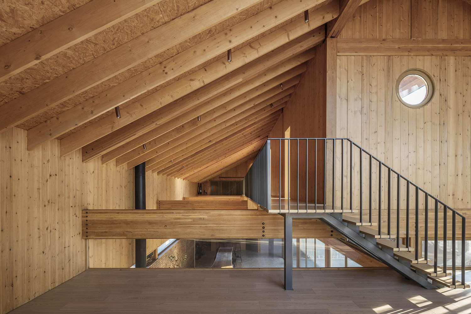 The three trees became the starting point of the design concept and the origin of the name "Lei Su".. The character 'Lei' originates from ancient agricultural tools and represents the living conditions of rural farming. The character shape contains three woods, and the interwoven wooden frame resembling a tree becomes the basic intention of the building. The building is constructed with trees forming a courtyard, with two appropriately sized courtyards centered around the position and crown width of the original trees, bringing ample sunlight and a landscape of seasonal changes to the internal space, and continuing the basic pattern of village courtyard architecture. The main structure of the building is made of laminated wood, and under the shape control of the double sloping roof, it supports the platform space with staggered heights, creating a living experience of being in the forest.