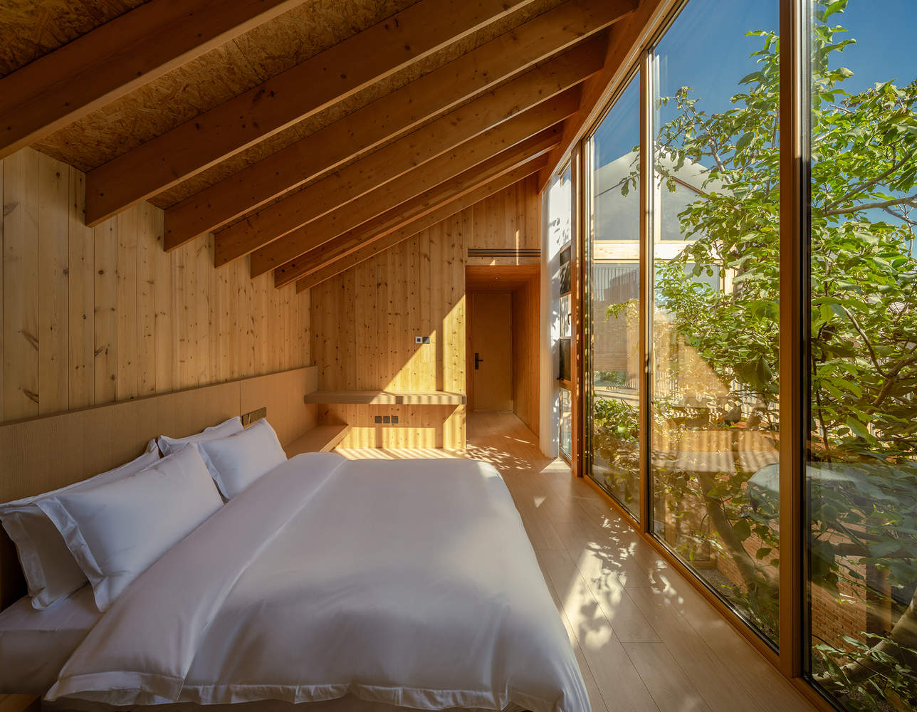 建筑首层沿街边界以实墙围合,内部则向庭院完全开放,布置了客厅、餐厅、厨房等公共休闲空间以及一个户主卧室。二层三个错层平台漂浮于砖墙之上,与姿态各异的树木形成对景,这里布置了六间客房,分为标准客房、榻榻米单人房、loft 亲子房等多种类型。建筑开辟了两处屋顶平台,高处可远眺附近的群山。