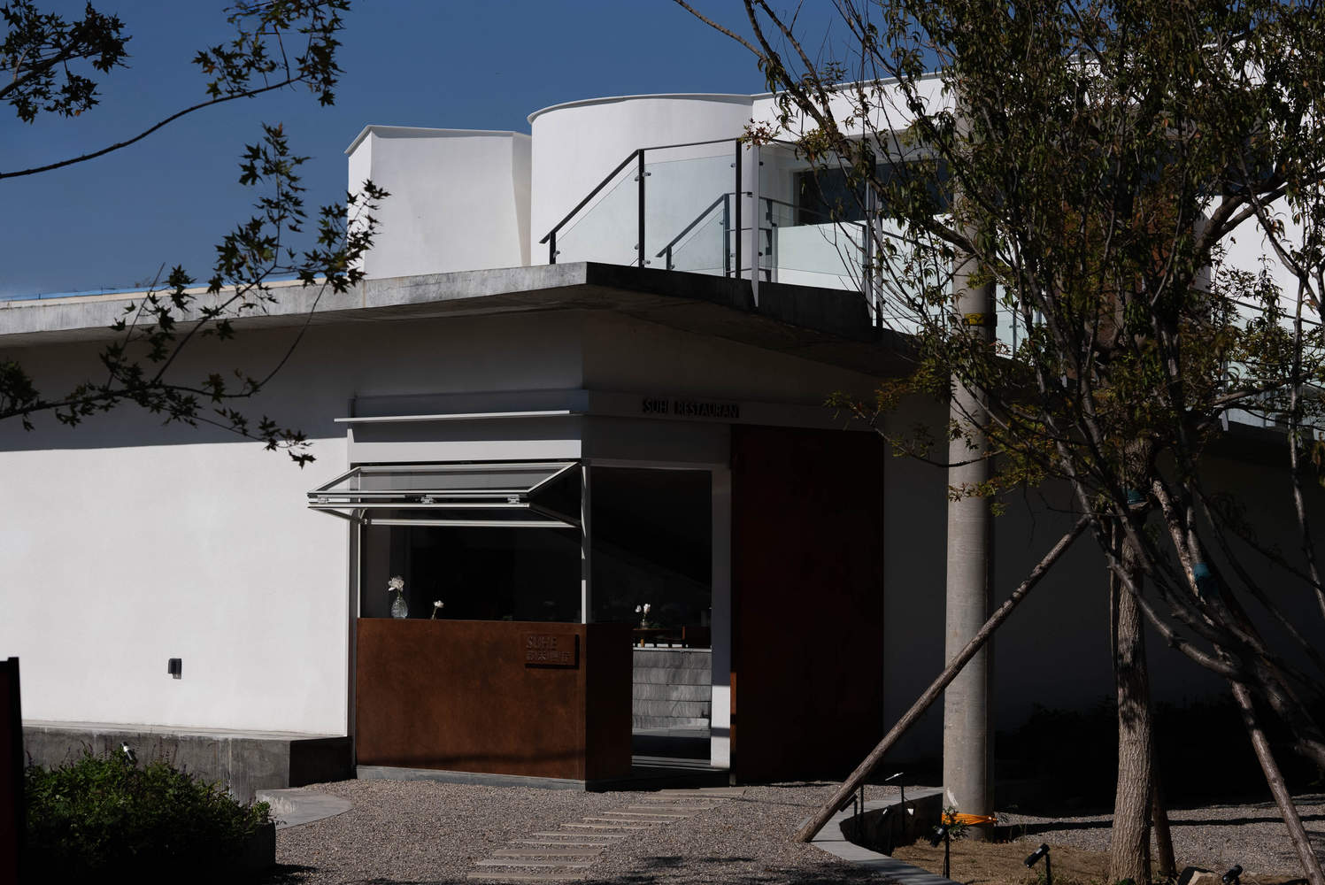 项目选址与环境的巧妙融合:苏禾餐厅的选址极具策略性,位于北京延庆八达岭镇,紧邻八达岭长城景区,同时周边环境包括民居、学校以及京张铁路,使得建筑与丰富的景观元素交织。这种选址策略为设计提供了独特的背景,既能远眺长城山脉的壮丽,又能近观民居的日常,甚至感受火车的动态。设计师充分利用了这种多元的环境,将建筑融入其中,而不是孤立地存在。这种对环境的敏感和利用,体现了设计师对场地文脉的深刻理解,为项目赋予了丰富的内涵。