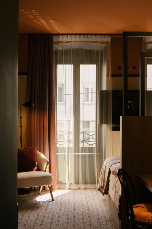精湛的工艺与材料运用:项目对材料的选择和工艺的把控达到了极高的水准,这是其成功的关键之一。木材、黄铜和玻璃等材料的运用,不仅营造了温暖而典雅的氛围,更体现了维也纳手工艺的精髓。定制的图案滚轮、地毯以及独特的门格栅等细节,都与当地工匠紧密合作完成,彰显了项目的独特性。这种对细节的极致追求,使得酒店的每一个角落都充满了艺术感和历史感。建筑师通过对材料的精心选择和巧妙运用,将现代设计与历史文脉完美结合,展现了深厚的设计功底和对建筑的深刻理解。