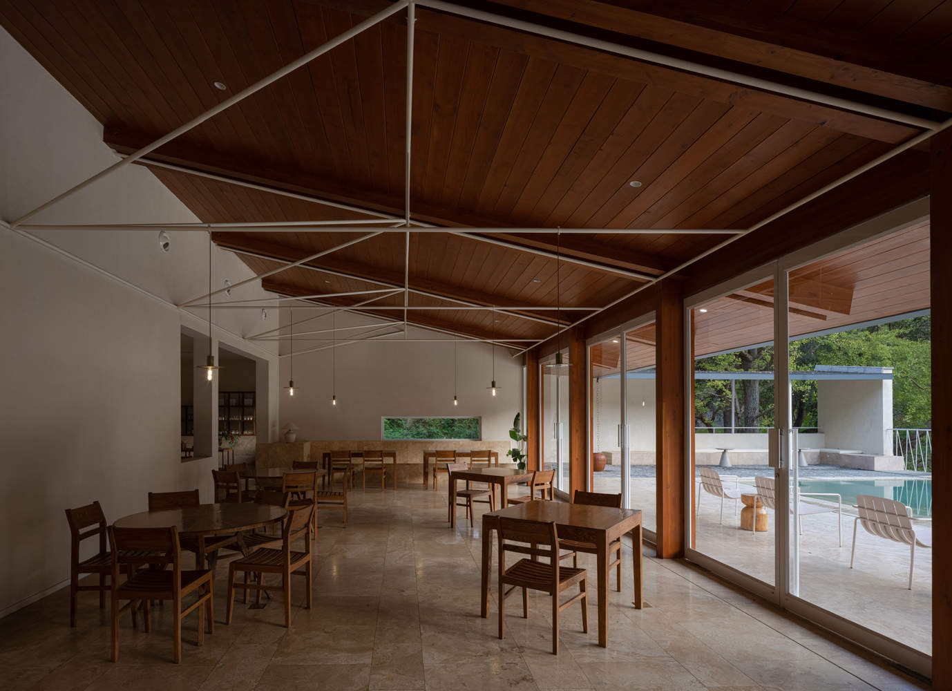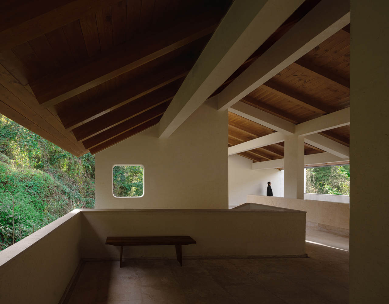 开放的景观茶亭以暗色调的木结构、烧杉木瓦和本地毛石构筑,隐身在两个白房子—— 咖啡厅和客房之间。