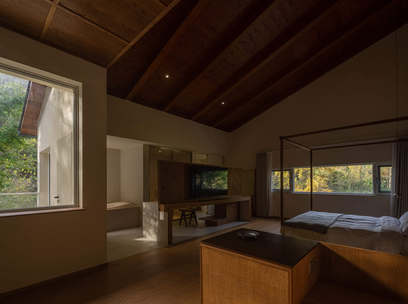 细节与整体的和谐统一: 整个项目在细节处理上同样出色,从前厅的设计到茶亭的选材,都体现了建筑师对整体氛围的精准把握。前厅延续了三合院的布局,通过屋顶的错落和坡度的设计,营造出内院的围合感。开放的景观茶亭则采用暗色调的木结构和当地毛石,与周围环境融为一体。设计师将每一个建筑元素都视为景观的一部分,通过对材料、色彩、光影的精心控制,使建筑与周围环境达到和谐统一。这种对细节的关注,以及对整体氛围的营造,使得整个项目不仅仅是一个民宿,更像是一件艺术品,它能够激发居住者对场地的情感共鸣,带来令人难忘的居住体验。