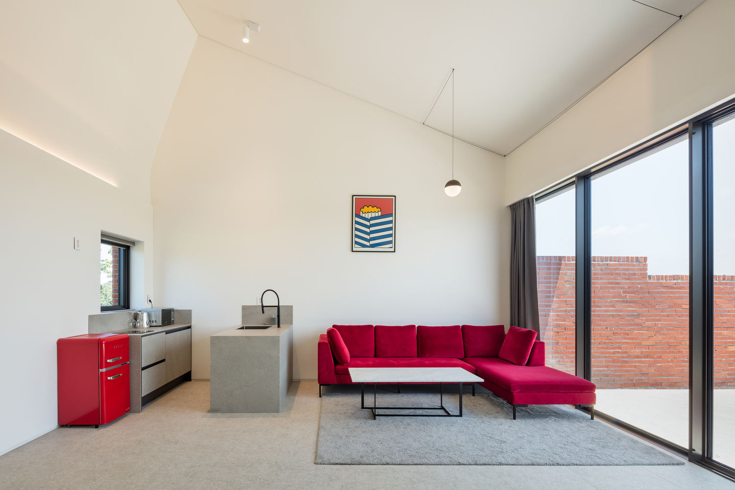 建筑形式与空间体验:项目在建筑形式上展现了独特的设计语言。倾斜且相连的屋顶线条灵感源于自然地平线,这种设计不仅在视觉上与周围环境相呼应,也在功能上提供了更佳的采光和通风效果。别墅内部空间则通过色彩、材质等元素的运用,营造出独特的空间体验。例如,鲜艳的橙色砖块、沙发以及红色的游泳池,巧妙地呼应了济州岛的地域特色,为居住者带来了视觉上的愉悦和情感上的共鸣。五栋泳池别墅在同一屋顶下相连的设计,既保证了空间的整体性,又通过倾斜屋顶的动态互动,为每栋别墅创造了独特的空间体验。