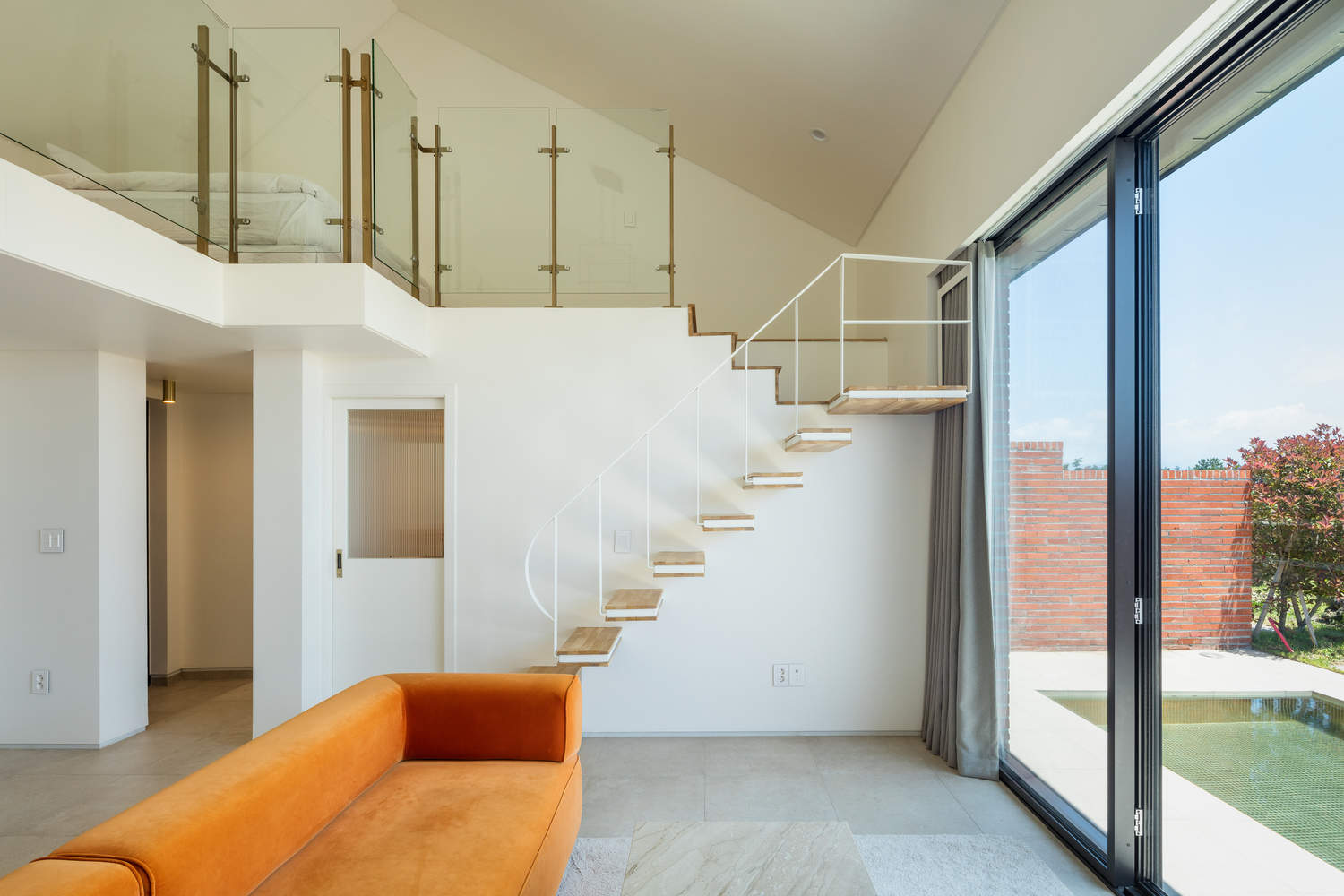 The project was conceived with deep consideration on how to seamlessly integrate Jeju Island's blue sky, basalt rock walls, and man-made buildings into the surrounding landscape. The villa features sloping and connected roof lines inspired by the natural horizon, and is made of heat-resistant and pollution resistant zinc material. The interior actively incorporates the colors of Jeju Island, using bright orange bricks, sofas, and a red swimming pool.