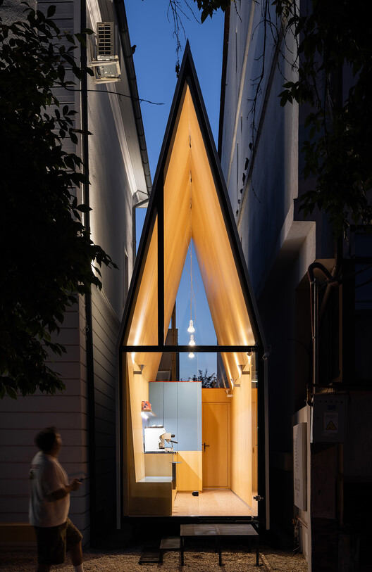 1. Site analysis and micro contextualization: We have conducted meticulous measurements and observations of microclimate, lighting, and pedestrian flow patterns as a basis for decision-making.. 2. Container of Light: The design revolves around two main functions: blending the cold hardening of concrete and introducing natural light.. The sharp triangular shape maximizes the expansion of spatial volume and visual tension. 3. Materials and Construction Techniques: We use lightweight and precise steel structure frames for quick construction.. High performance three glass low emissivity glass dominates the exterior facade, maximizing transparency and creating a prism like visual effect. The interior is decorated with light colored wood, creating a warm and peaceful atmosphere of a monastery. 4. Off site prefabrication: Most of the components of the structure are prefabricated off-site, ensuring fast assembly, minimizing construction interference, and reducing waste in a compact urban environment..