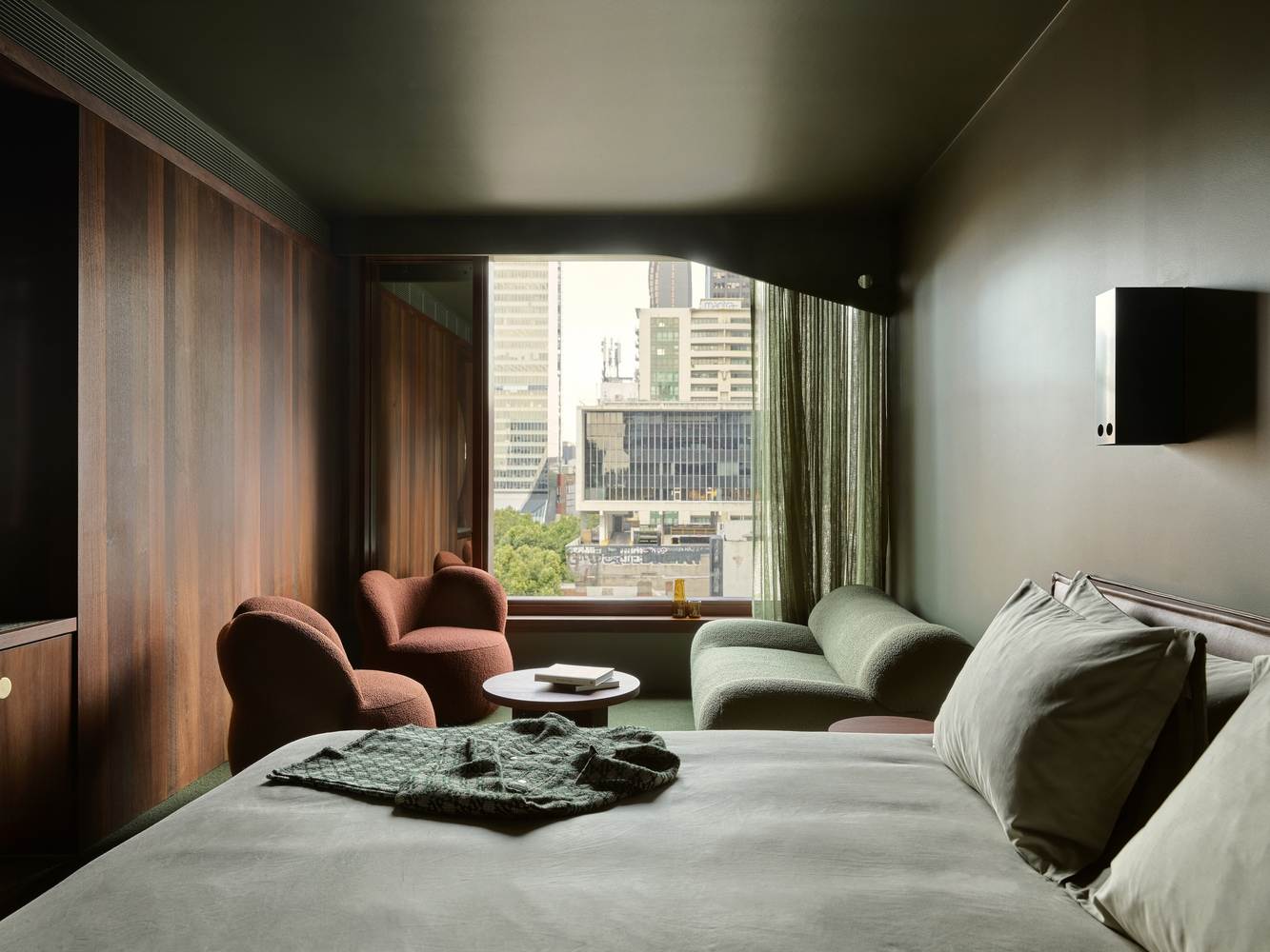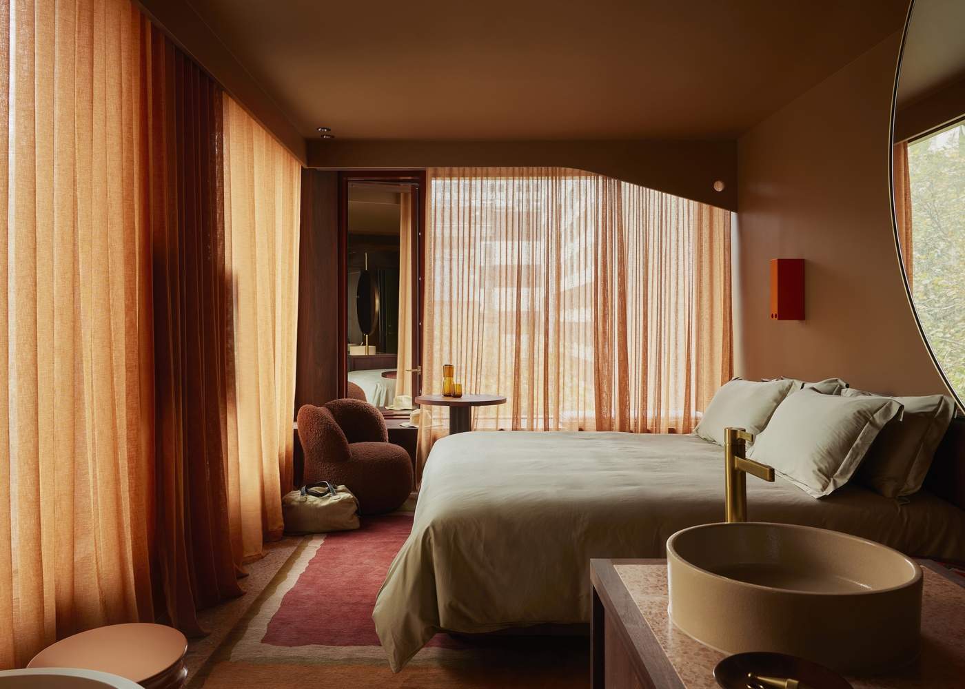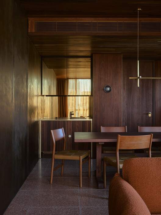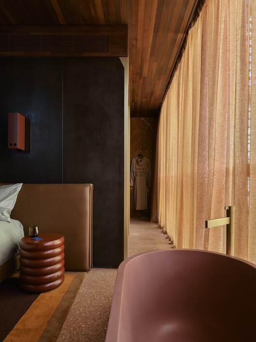 材料和工艺的精湛运用与本地文化的融入:项目的另一个亮点在于对材料和工艺的精湛运用,以及对当地文化的尊重和融入。建筑师特别定制了砖块,并结合暖色调的预制混凝土,打造出柔和、内敛而自然的色调,同时搭配深红色金属装饰和窗框,形成了独特的视觉语言。室内设计中,天然材质(如西澳大利亚的贾拉木和本地采购的水磨石)与色彩设计相互映衬,营造出温馨舒适的氛围。此外,酒店大量采用本地制造商和设计师的作品,并委托当地艺术家创作,展现了墨尔本当代、精致、多元包容的文化精髓,使酒店不仅仅是一个住宿场所,更是一个文化体验的场所。