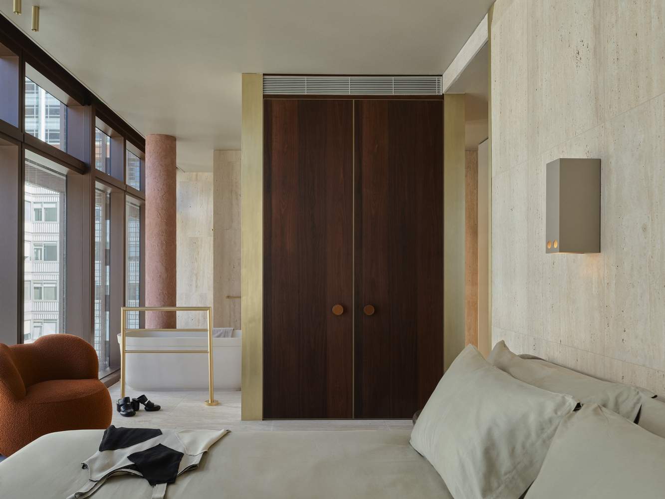 这座建筑色调柔和、内敛而自然,采用了专为该项目研制的砖块(与斯特韦尔的克劳斯砖厂合作生产)以及暖色调的预制混凝土,并配以深红色金属装饰和窗框作为点缀。砖块元素延伸至室内,与色彩设计相融合 —— 时而浓烈,时而俏皮,旨在给人留下深刻印象。室内色彩与大面积相得益彰的天然材质形成对比 —— 西澳大利亚州的贾拉木(jarrah)、专为墨尔本广场酒店定制调配的本地采购水磨石,以及黄铜和耐候钢材质的金属装饰。