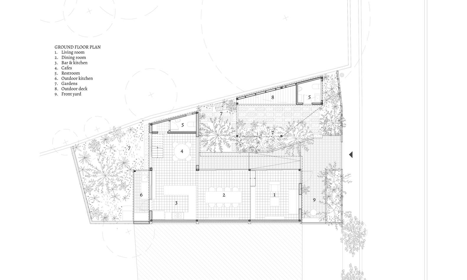 打理这片种有本土植被的花园,让人回想起当地照料植物的传统:观赏植物与蔬菜、果树、攀缘植物以及遮荫树种相互交织。前院低矮的围栏和起伏的地形,呼应了本土园林宅院中那为人熟知的布局手法,同时也间接暗示了宅院后方不远处就是河岸码头。可开合的边界设计进一步增强了项目内部的纵深感。