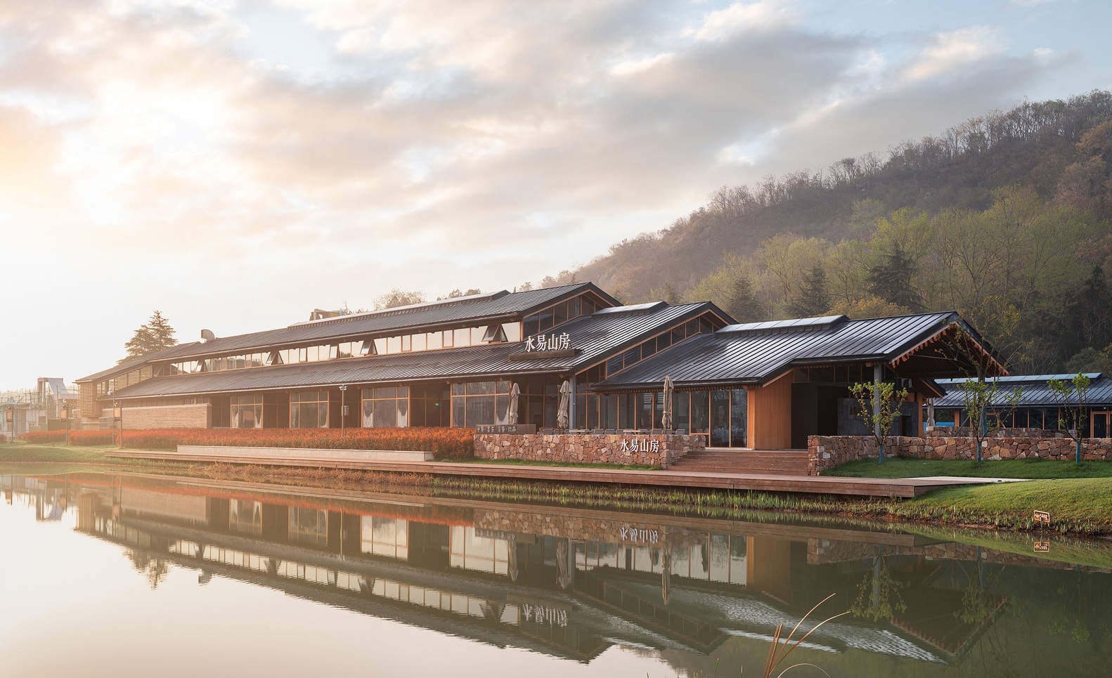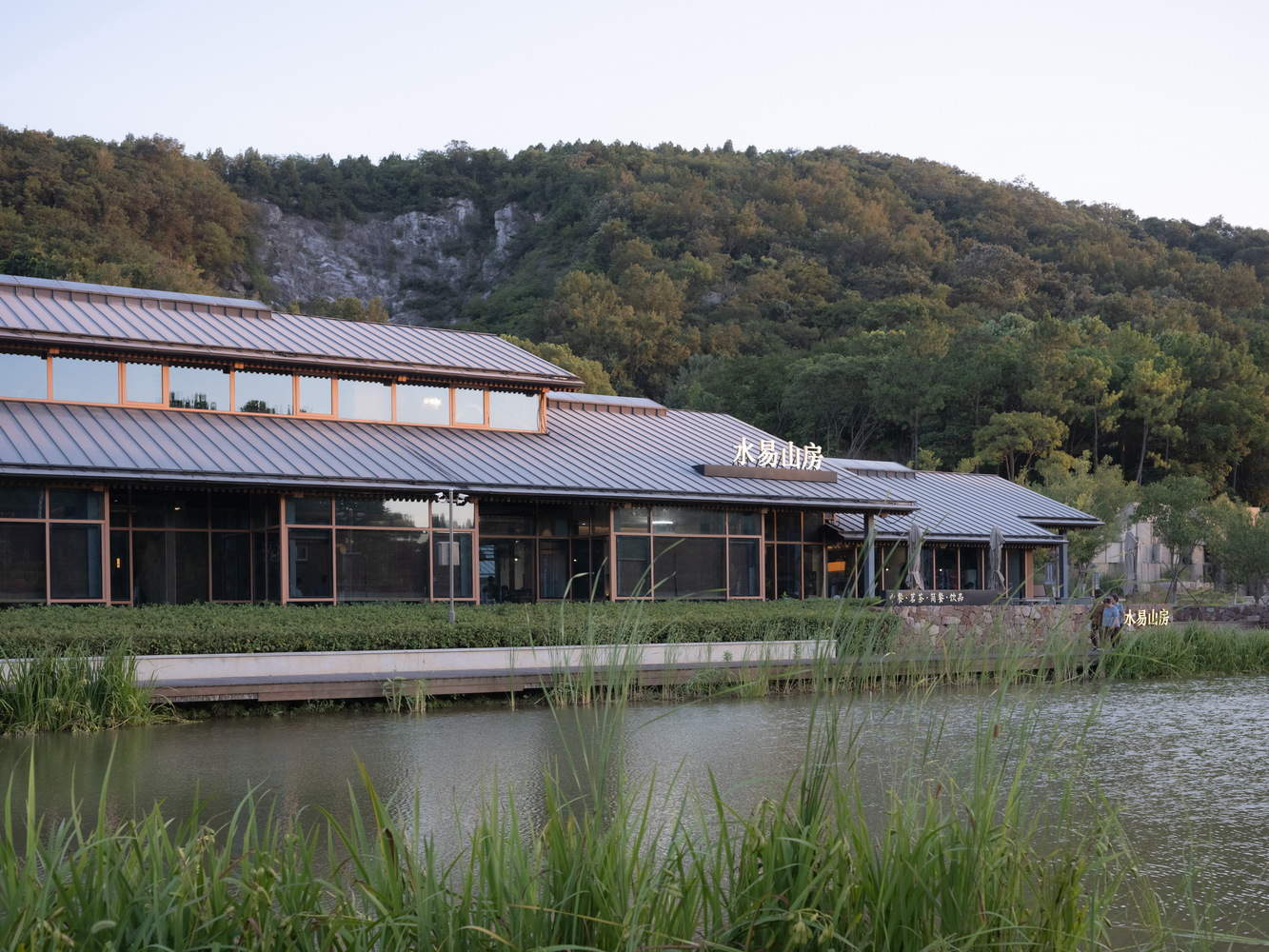 场地中原有的公交场站办公楼是一个长条形的二层砖混结构建筑,它之所以呈线性布局主要是因为沿着一条排水渠修建的原因,而建筑的另一侧是景区内的一块扇形的林地。受制于这些条件,设计依托了原有建筑的基底重新布局了一座布局相似的一字型建筑。考虑到汇水以及暴雨时的行洪因素,原本敞开的排水渠在建筑这一段被改造成为地下的箱涵,地面上则利用一个景观水塘来作为地表径流的汇集水体。这个滨水的新建两层高坡屋顶建筑,其功能为社区餐厅,一层为堂座和包间,二层为可举办宴会的大厅,满足了旅行团及当地人的宴会需求。