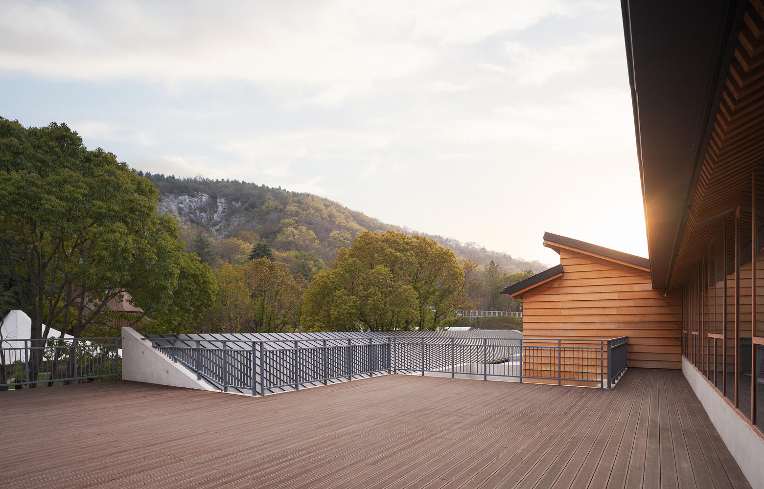 The Ape Man Cave is famous for the discovery of upright human fossils in caves on the mountain. The cave is the climax of the entire scenic area, so the buildings and structures in the front area should not appear in a noisy manner. How to coordinate with the gentle ridges and enhance their guidance is the primary issue that buildings need to consider. Therefore, the building is located at the foot of the mountain in a "lying" posture, without shaping itself into a shape that imitates caves or ancient architectural images. Because artificially shortening the time gap will only destroy the true value of historical relics, but through continuous eaves and corridors, the gray space makes the building look more like a "guide", welcoming and humble. The posture leads visitors into historical relics.