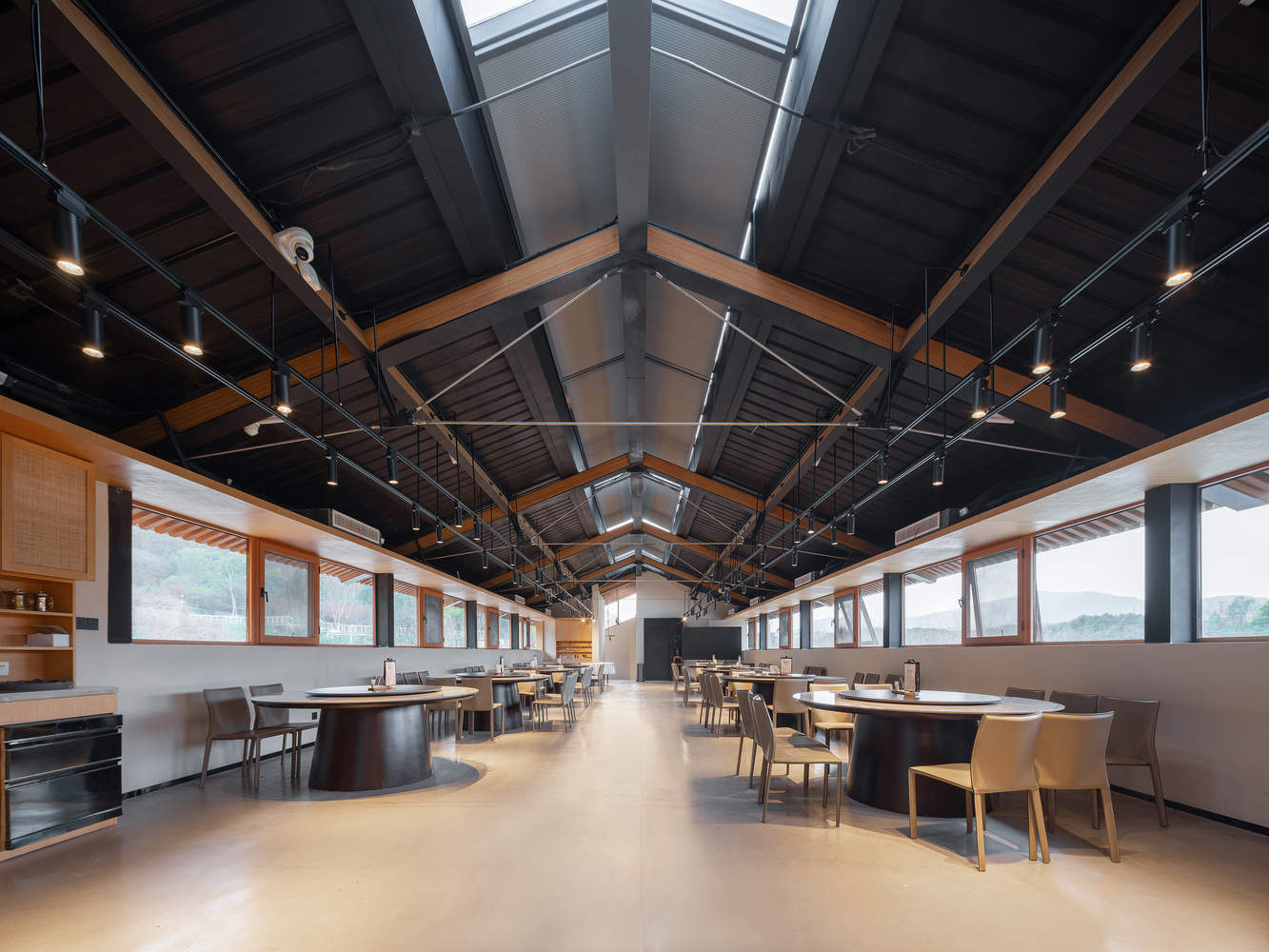 Small sized lightweight steel structures also have the characteristics of assembly. The elongated community restaurant adopts a steel frame structure system, and the transition from the roof of the porch on the first floor to the roof of the banquet hall on the second floor is carried out in a sequential lifting manner, which presents a double eave image in the direction of pedestrian flow. The roof truss adopts a chord beam structure to reduce the cross-sectional size of the steel beams. On the side facing the water pond, several private dining rooms are arranged under the long horizontal eaves, and the exterior wall of the kitchen is separated from the eaves by a rammed earth wall. The second floor roof also uses the shape of a staircase at the end to form a bite on the rammed earth wall. The combination of elements such as walls, eaves, and gardens in architecture reconstructs a new order of the place.
