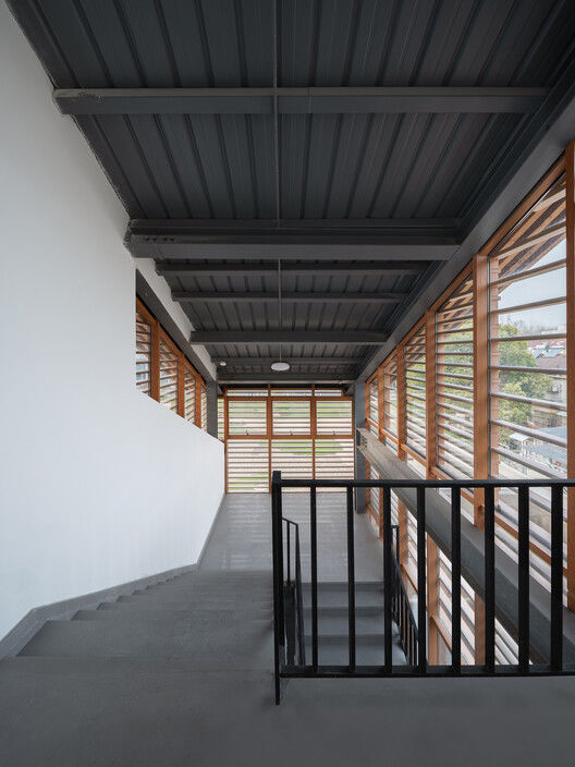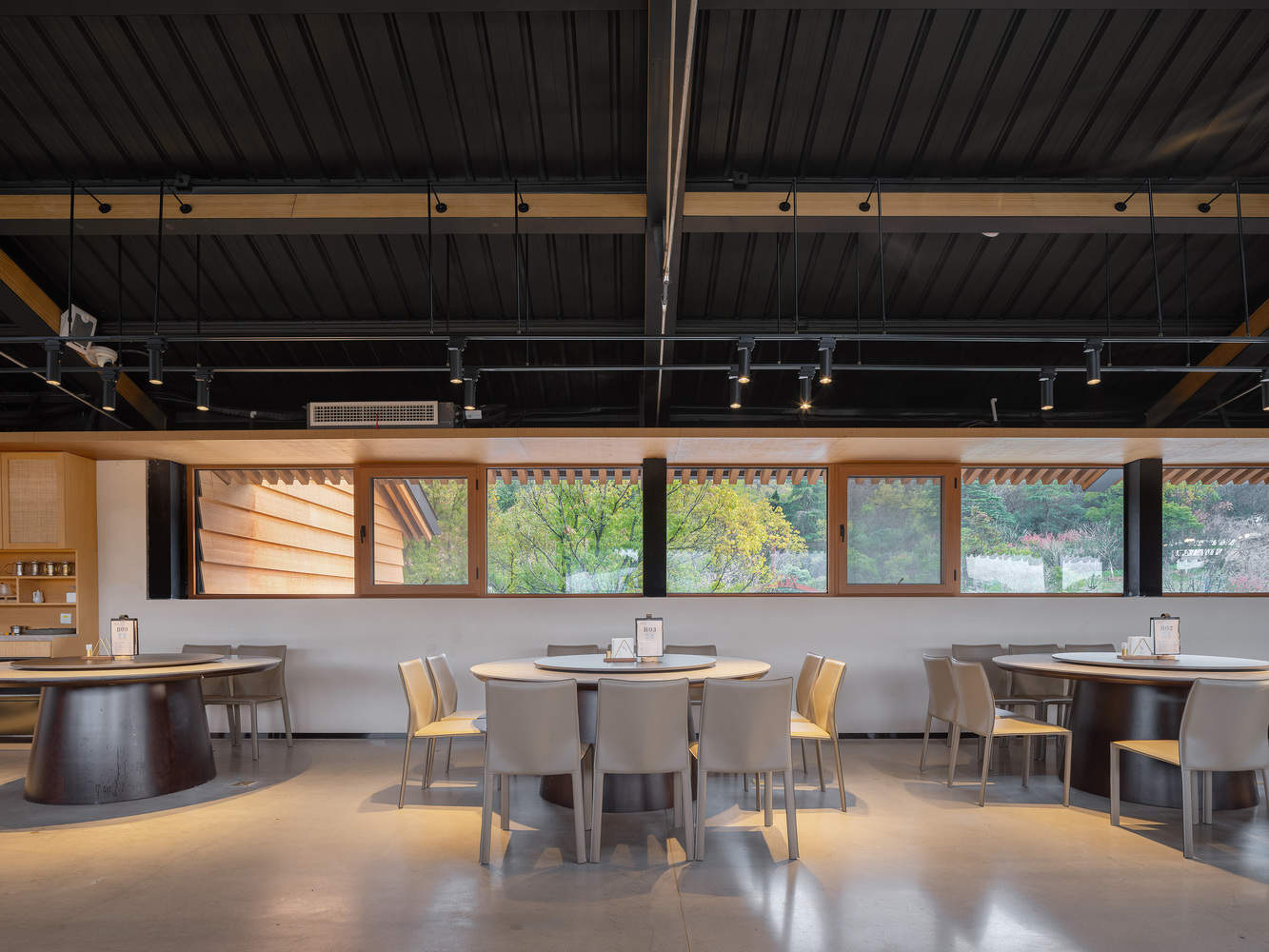 In addition to using small volume, transparency, and lightweight features to express a low disturbance intention to the site, architecture also reflects a posture of dialogue with the natural environment in local details.. The entrance of the community restaurant features several low walls made of rubble, defining two platforms that fall towards the water surface, creating a relaxed and comfortable outdoor space for the restaurant. The concrete roof of the rammed earth wall in the narrow and long courtyard extends in a row of water tongues towards one side of the courtyard, and on the other side, a full-length inner gutter protrudes towards the sloping roof of the children's restaurant on the first floor, which is precisely embedded between the wall and the engineering bamboo columns. The water tongue drains the rainwater from the inner gutter, and a concrete sink is used below to receive the falling rainwater. This "one spit, one receive" scene is highly symbolic of Chinese culture and has become a backdrop for the courtyard Chinese restaurant. The roof of the kitchen at the east end of the building is an outdoor platform that is close to the tree crown and overlooks the mountain of the Ape Man Cave, creating a pleasant outdoor dining atmosphere. Windows are a medium for indoor characters to perceive outdoor scenery, and the treatment of windows in this design presents different forms depending on their location. The private rooms on the first floor facing the pond use glass boxes separated from each other under the eaves to give diners a feeling of being enveloped by the outdoor environment. The banquet hall on the second floor adopts horizontal long windows, and the scenery of the mountains and forests seems to unfold along the interior like a painting. The black titanium zinc sheet metal roof contrasts with the light warm colors of rammed earth and bamboo wood at the bottom, and the top and high side windows on the roof provide opportunities for tree branches and light to appear at the top of the building interior. These measures are constantly promoting dialogue between indoor users and the outdoor environment.