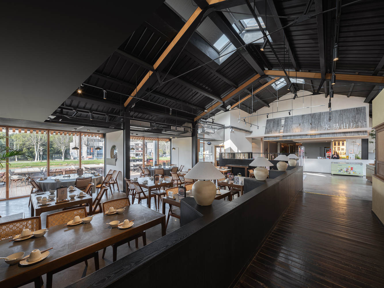 The original bus station office building in the site is a long, two-story brick and concrete structure. Its linear layout is mainly due to its construction along a drainage channel, while the other side of the building is a fan-shaped forest in the scenic area. Constrained by these conditions, the design relied on the foundation of the original building to rearrange a similarly laid out linear building. In consideration of catchment and flood discharge during rainstorm, the originally open drainage channel is transformed into an underground box culvert in this section of the building, and a landscape pond is used on the ground as the catchment of surface runoff. This newly built two-story high pitched rooftop building on the waterfront serves as a community restaurant. The first floor is for seating and private rooms, and the second floor is for a banquet hall, meeting the banquet needs of tour groups and locals.