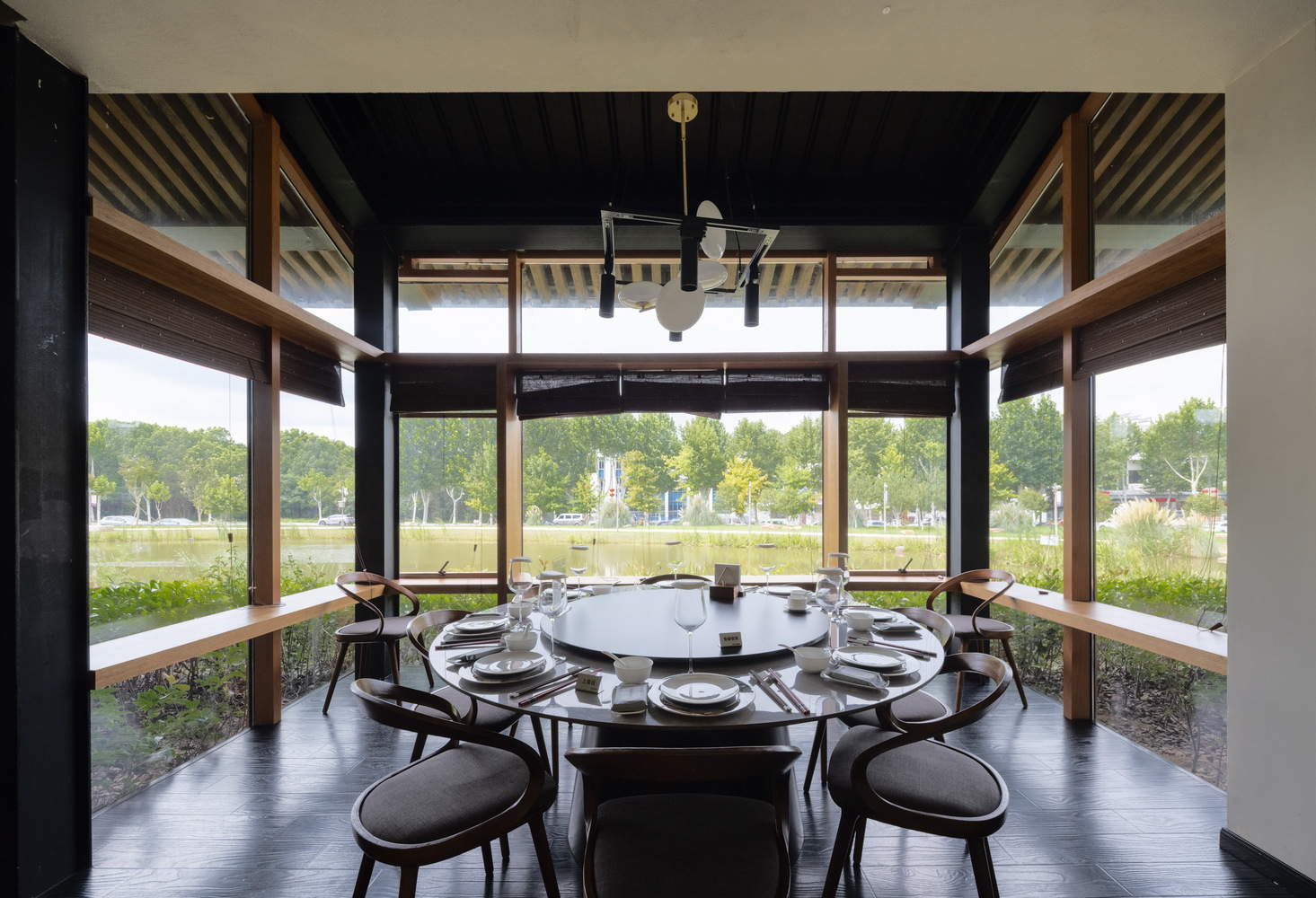 建筑除了用小体量、通透感和轻质化的特征来表达对场地的低干扰意愿之外,建筑在局部细节上也体现出与自然环境对话的姿态。社区餐厅入口处的几道毛石砌筑矮墙,界定出两片朝水面跌落的平台,成为餐厅轻松惬意的外摆空间。窄长庭院里的夯土墙顶的混凝土压顶朝庭院一侧伸出一排阵列的水舌,另一侧面向一层儿童餐厅的坡屋面出挑一条通长的内天沟,天沟正好嵌在墙体和工程竹柱子之间。水舌排走内天沟的雨水,其下方利用混凝土水槽来承接落下的雨水,这“一吐一纳”的景象颇具中国人文象征性,也成为庭院中餐厅的对景。建筑东端厨房的的屋顶,是一个接近树冠并能眺望猿人洞山体的室外平台,这里营造出宜人的室外就餐氛围。窗,是室内人物认知室外景致的媒介,本设计中对窗的处理因其所处位置有异而呈现出不同的形式。朝向水塘的一层包间利用屋檐下相互脱开的玻璃盒子让用餐的人有一种被室外环境包裹的感觉,二层的宴会厅采用水平向的长窗,山林的景象仿佛一幅画卷沿室内展开。黑色的钛锌板金属屋顶与下部的夯土和竹木的浅暖色形成对比,屋顶上的顶窗和高侧窗,又为树梢、光影出现在建筑室内的顶部提供了契机,这些举措都在不断的促进室内的使用者与室外环境之间的对话。