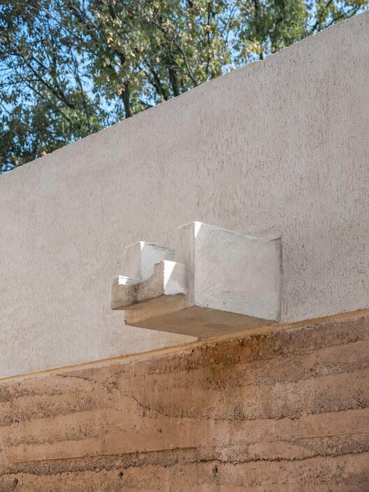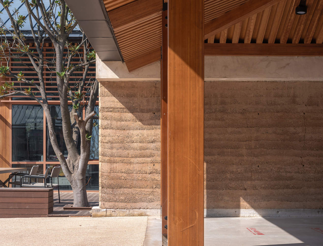夯土为墙,即使不是简单的围墙,但墙依旧在建筑中扮演着重要的角色。在加入钢筋、水泥等现代材料后,夯土墙的抗裂性和防水性得到改善,在纵横向墙体的相互的配合下,长长的夯土墙起到了物理空间分隔的作用,也似一条主线,让其它的空间附着其上生长出来。工程竹作为一种工业化胶合生物质材,通过钢连接板,让其具备了装配式的特点,工程竹框架结构与夯土墙脱开设置,让内部空间具备了根据功能灵活分隔的可能,并且因为结构自重轻、基础小的特点,这让建筑在水渠和树林之间的场地施工时具备较为优秀的适应性。