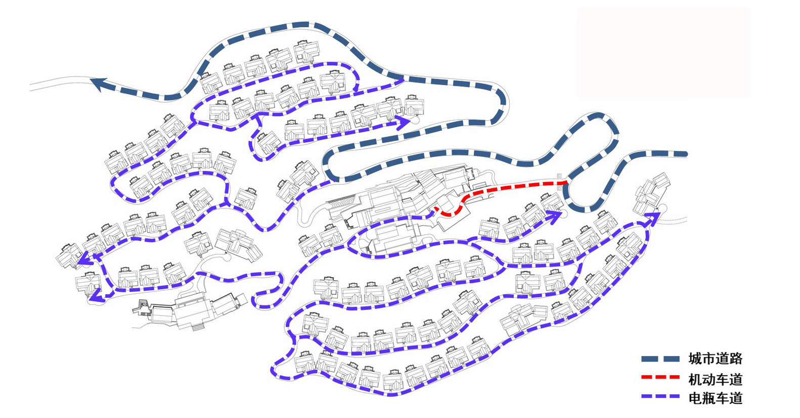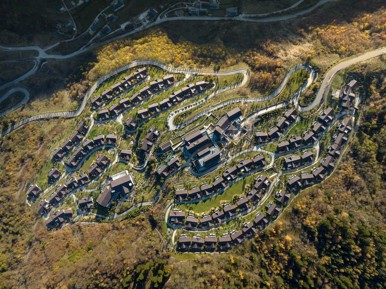 Rissai "means" village "in Tibetan, symbolizing a pure land built in a valley with a thousand years of cultural heritage. The formation of the spatial pattern of traditional Tibetan villages is closely related to terrain, climate, production and lifestyle, as well as religious culture. The overall layout of traditional Tibetan villages in mountainous areas is scattered, arranged in a staggered manner according to the mountain terrain, with watchtowers as the core and roads winding along the terrain. Residential buildings enclose courtyards, taking into account wind and cold prevention as well as defense. They are hidden in dense forests and blend harmoniously with mountains, forests, and streams. The hotel is located on the west side of the valley in the middle of Zhongchagou, with the entire site situated in the middle of a steep slope that is high in the west and low in the east. The highest point within the land has an elevation of 2400m, the lowest point is 2311m, and the maximum vertical height difference is 89m. To the east of the valley, there is the Tibetan village "Boryeo Village" hidden in the Zhongchagou Valley, with its original flavor. The overall planning of the hotel draws inspiration from the scattered layout of traditional Tibetan villages in mountainous areas, following contour lines and adapting to the situation. The project covers an area of 166088 square meters, with a total construction area of 36217 square meters, including 87 luxury private villas, hotel public areas, and SPA. The overall layout is centered around the public area in the central hinterland, with other buildings surrounding it in a row among the shallow mountains, living in harmony with the scenery, like a quaint village, echoing the "Borio Village" across the valley, truly a luxurious "hidden world". The hotel is connected to the outside world through a winding mountain road. After entering the hotel area, one can travel up the road to reach the public area, pass through a gate, and under the guidance of a private butler, transfer to a sightseeing bus to stay in the guest room.