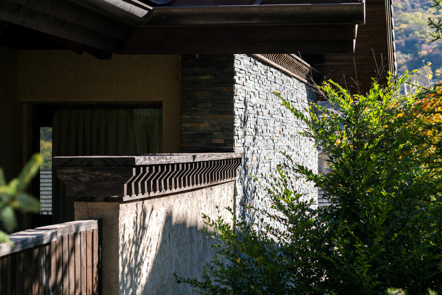 建筑风貌从藏羌传统中汲取灵感,以藏羌碉楼的雄浑与藏式木制榻板房的原始古朴为蓝本,建筑立面设计融入三段式形式,延续了量感明显的悬山坡屋顶,古朴宽厚的夯土与木板墙身以及收分适宜的基座。建筑构造设计提取传统藏式建筑的典型特征与符号语言,用于木构件的装饰设计中,演绎围墙“边玛墙”、窗楣“飞子木”,木门”门斗“等构造样式。建筑屋脊高低变化、穿插组合,建筑群落顶部线条灵动多变,在巍峨雪山背景的映衬下,建筑与环境和谐相融,共同勾勒出一幅至美的自然画卷。室内设计巧妙融合藏羌文化,室内空间摒除多余装饰,展露木结构体系,完整显现梁柱穿插交接之美与一品品椽子排列的节律之美。大堂功能区镜像布局、客房入户轴线遵循中正序列,这些视觉秩序无不体现着藏式建筑特有的庄重感。大堂吧复刻火塘与烟囱,还原民俗场景;客房床头装饰吉祥纹,地毯、楣梁与之呼应,公共区域采用吉祥纹作为空间分隔元素。室内摆放着藏式物件,很多都来自当地村民家,经过清洁或修缮后成为客房中的点睛之笔。这些凝练着地域基因的符号,让藏式风情自细节处自然流淌。